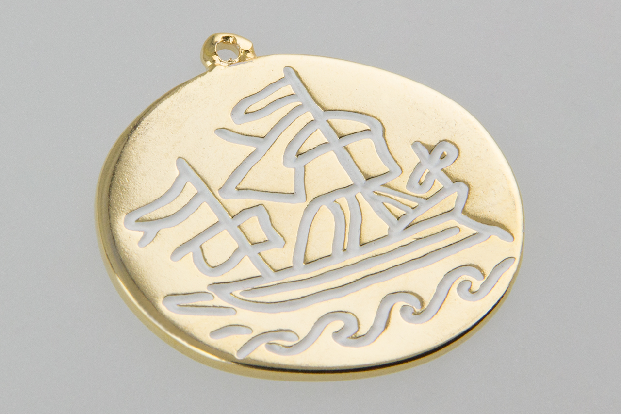 Μεταλλικό γούρι – μοτίφ πλακέτα ζαμάκ οβάλ με καράβι σε χρυσό 24Κ χρώμα.