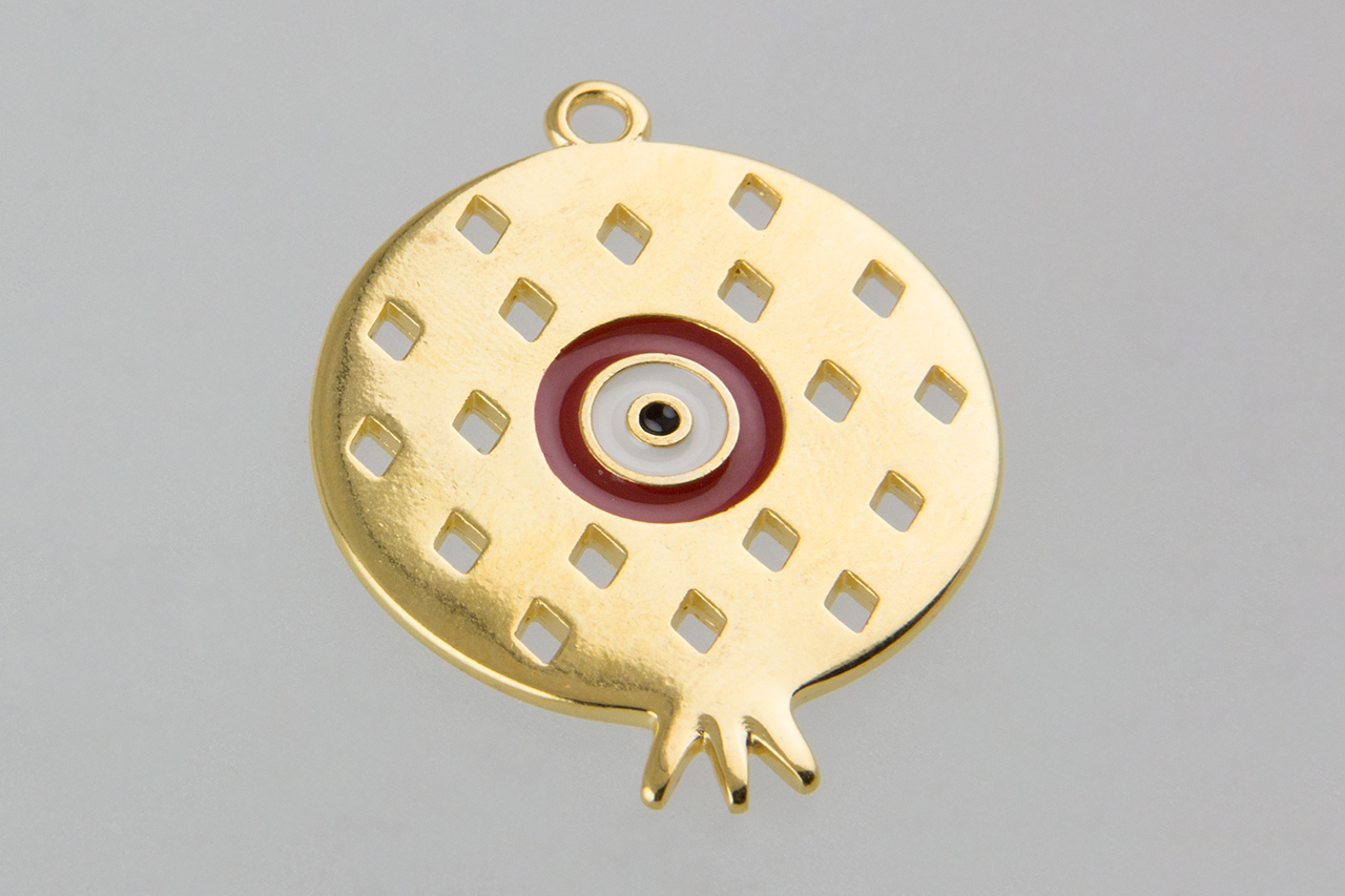 Μεταλλικό γούρι – μοτίφ ρόδι με ρόμβους και μάτι σε χρυσό 24Κ χρώμα.