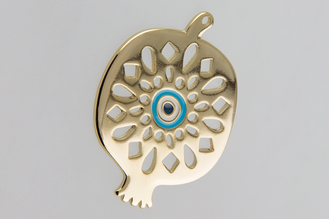 Μεταλλικό γούρι – μοτίφ ρόδι ζαμάκ διάτρητο με μάτι σε χρυσό 24Κ χρώμα.