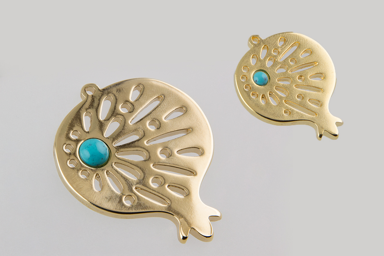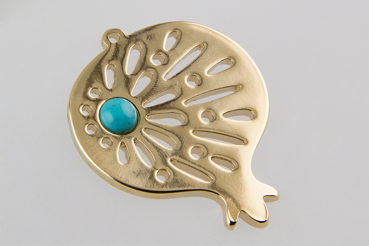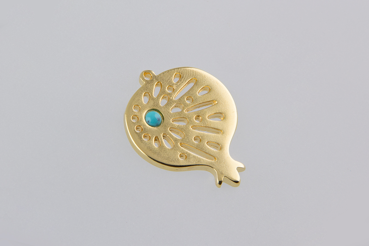 Μεταλλικό γούρι  – μοτίφ ρόδι ζαμάκ διάτρητο με τιρκουάζ πέτρα σε χρυσό 24Κ χρώμα.