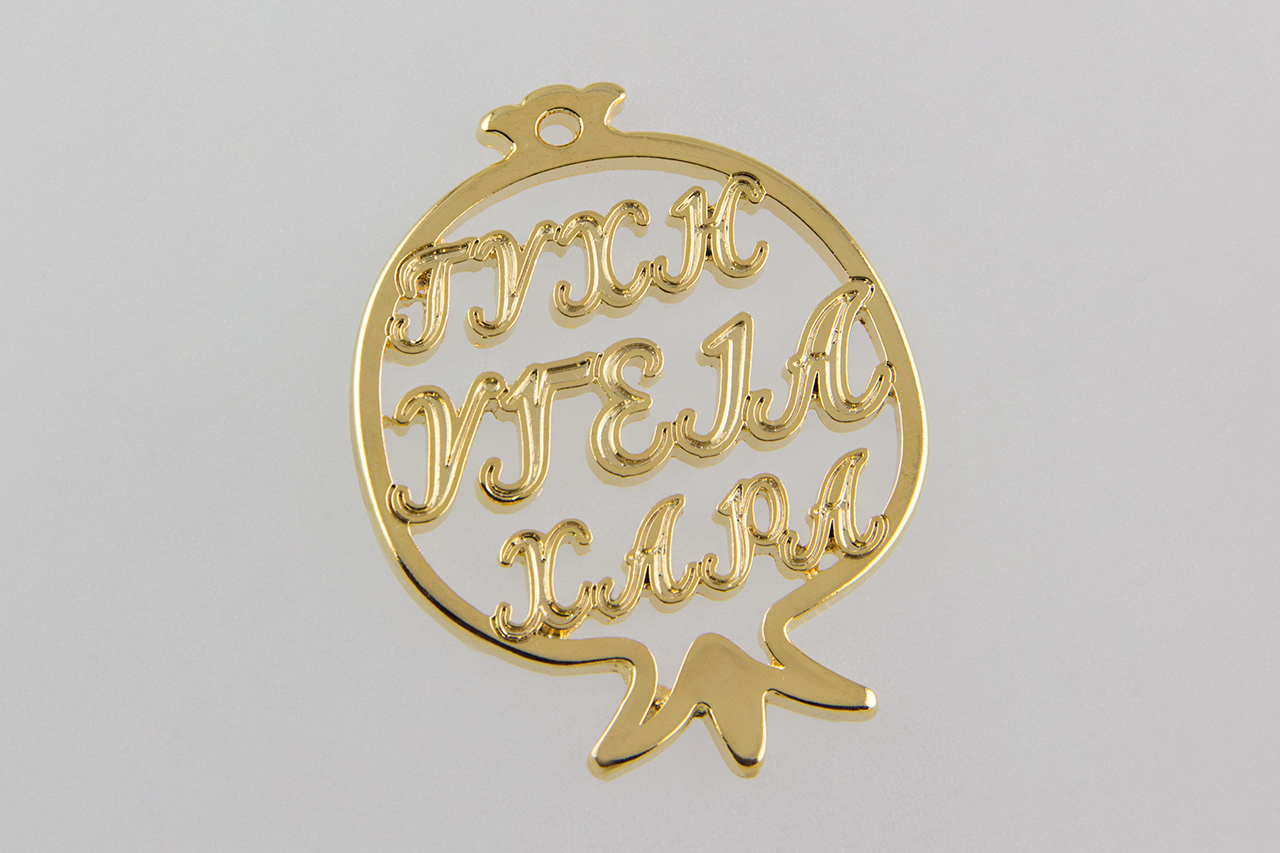 Μεταλλικό γούρι – μοτίφ ρόδι ζαμάκ με ευχές διάτρητο σε χρυσό 24Κ χρώμα.