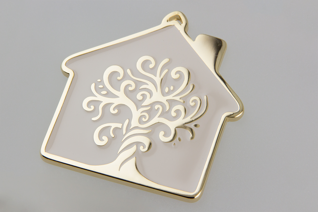 Μεταλλικό γούρι – μοτίφ σπίτι ζαμάκ με δέντρο σε χρυσό 24Κ χρώμα.