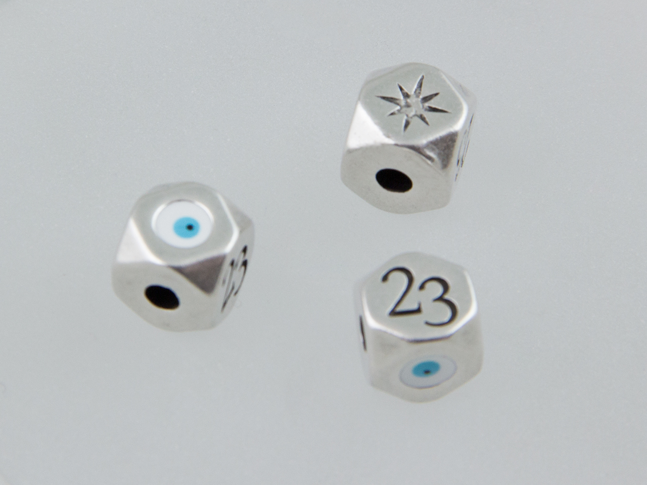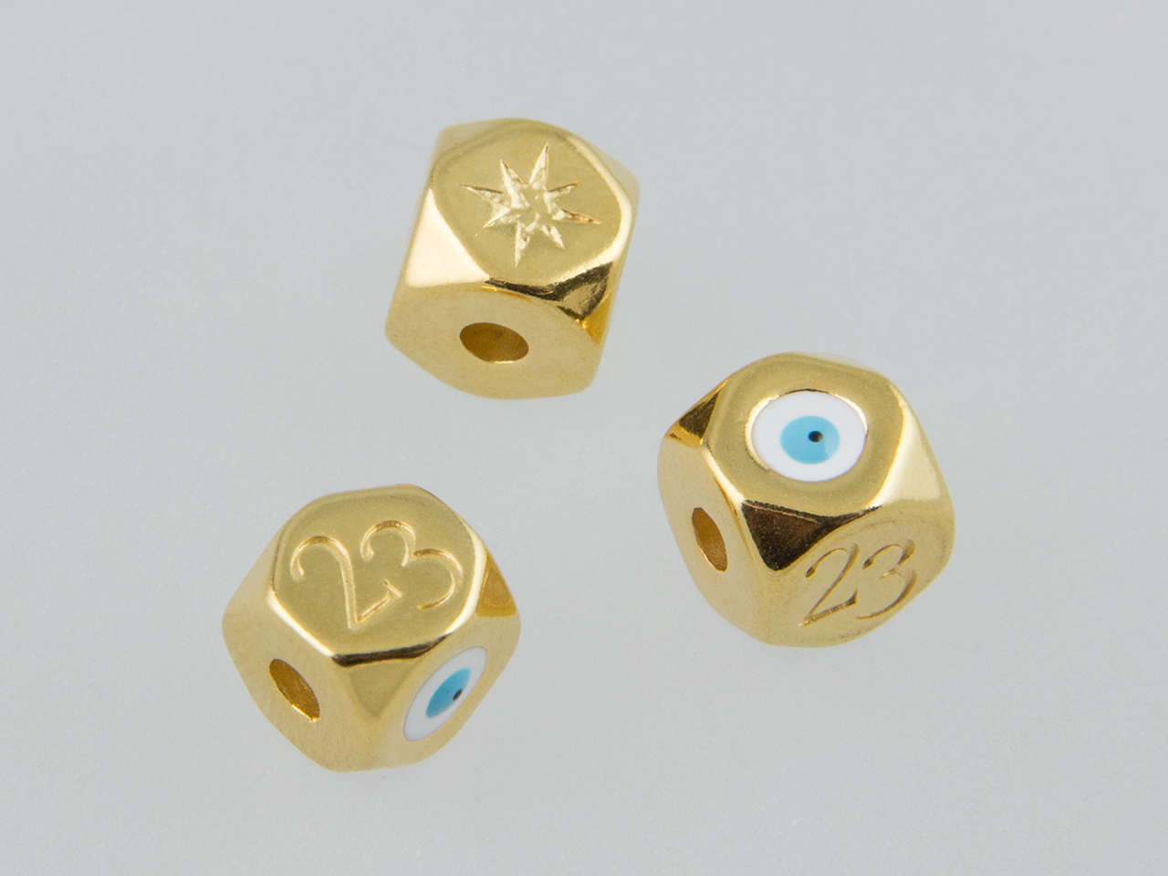 Μεταλλικό μοτίφ χάντρα κύβος πολύπλευρο no 23 με μάτι γούρι σε δύο χρώματα – χρυσό 24K και ασημί επάργυρο.