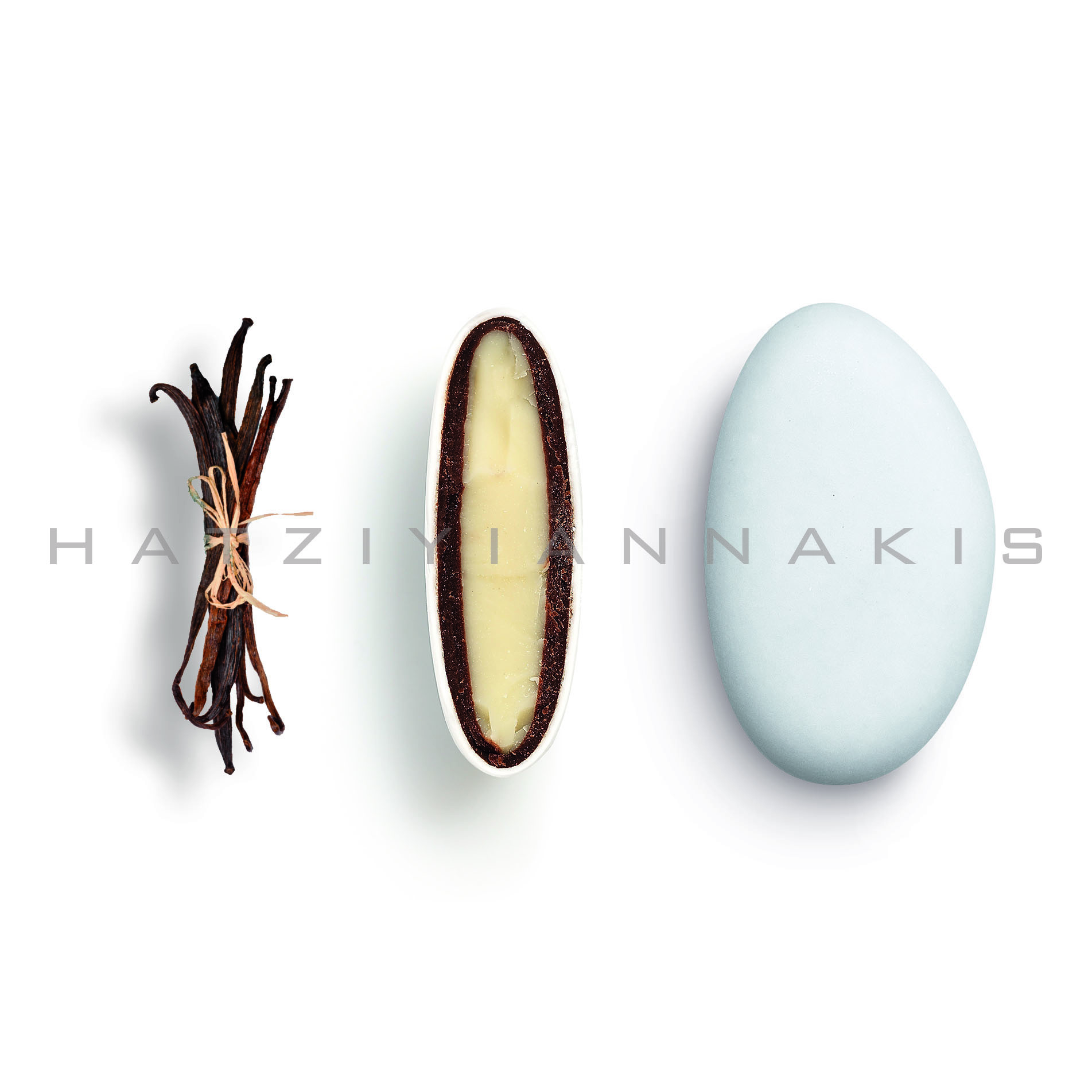 Κουφέτο με λευκή σοκολάτα & σοκολάτα (55% κακάο) με λεπτή επικάλυψη ζάχαρης, γεύση βανίλια.