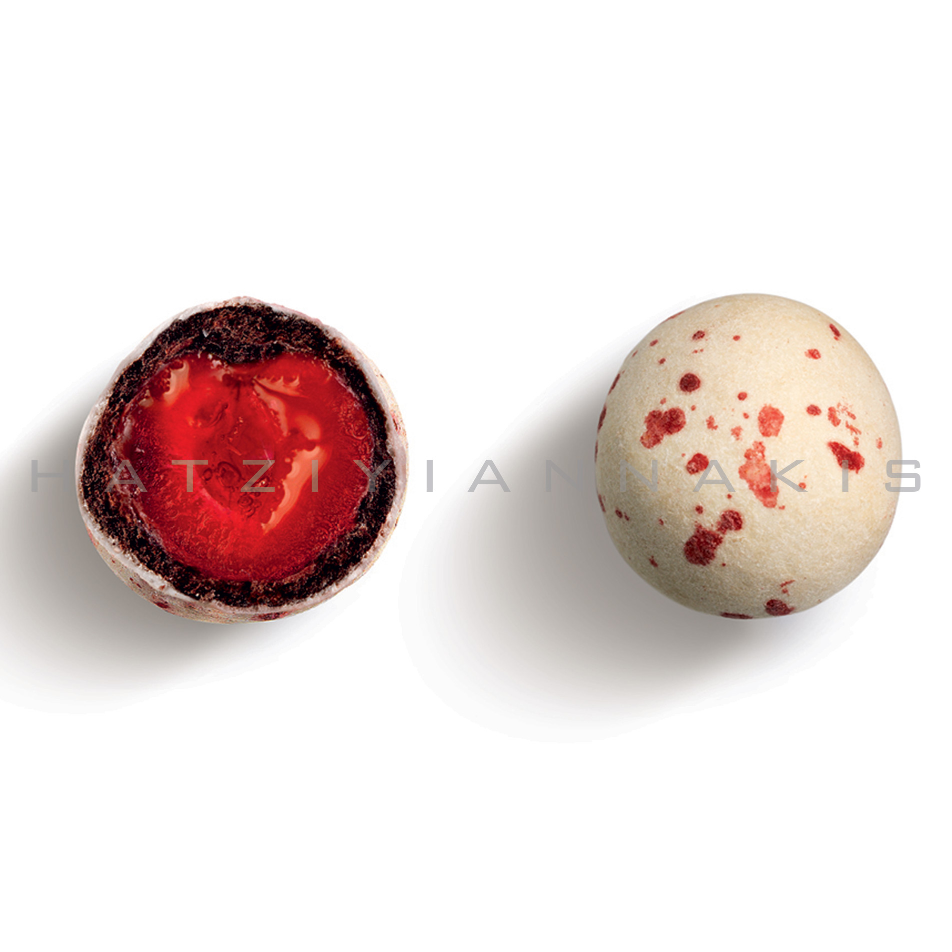 Ολόκληρο σιροπιαστό κεράσι & σοκολάτα (70% κακάο) με λεπτή επικάλυψη ζάχαρης.