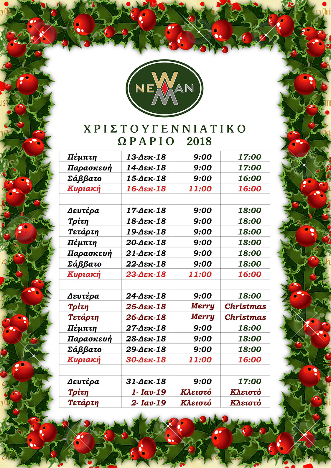 Το Χριστουγεννιάτικο ωράριο του καταστήματος NewMan θα διαμορφωθεί ως εξής: Ημέρα Ημ/νία Ώρες Πέμπτη 13.12.2018 9:00 – 17:00 Παρασκευή 14.12.2018 9:00 – 17:00 Σάββατο 15.12.2018 9:00 – 16:00 Κυριακή 16.12.2018 11:00 – 16:00 Δευτέρα 17.12.2018 9:00 – 18:00 Τρίτη 18.12.2018 9:00 – 18:00 Τετάρτη 19.12.2018 9:00 – 18:00 Πέμπτη 20.12.2018 9:00 – 18:00 Παρασκευή 21.12.2018 […]
