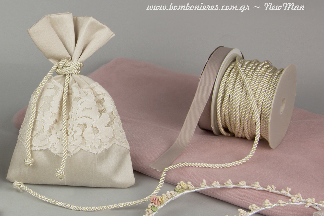 Τα μεταξωτά Σαντούκ πουγκάκια σε απόχρωση μόκας θα αποτελέσουν την ιδανική βάση για τις κομψές σας μπομπονιέρες με το αριστοκρατικό παραμυθένιο στυλ. Συνδυάζουν το μεταξωτό ύφασμα Σαντούκ εξαιρετικής ποιότητας -δείτε μόνο τη διαύγεια του υφάσματος και τις ιριδίζουσες αποχρώσεις του- με δαντέλα στο χρώμα της πούδρας ή σε ιβουάρ απόχρωση.
