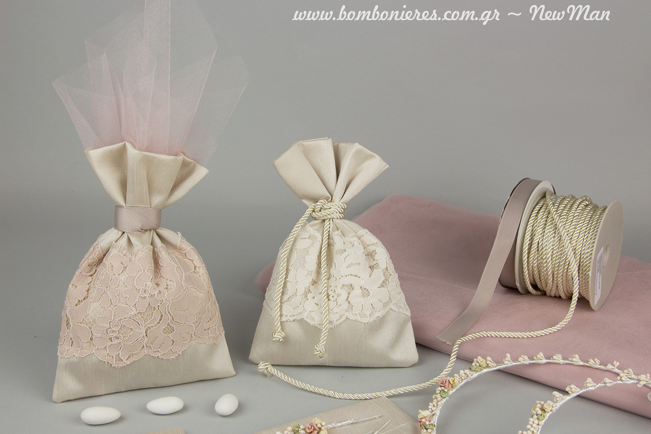 Όπως θα δείτε και στις φωτογραφίες η Λίλιαν Νιούμαν προτείνει δυο υπέροχες εκδοχές για την ιδιαίτερη αυτή μπομπονιέρα: στην πρώτη συνδυάζετε το μεταξωτό πουγκί Σαντούκ – δαντέλα σε χρώμα της πούδρας (14 x 20cm) με τούλινη μπομπονιέρα σε αντίστοιχη ουδέτερη απόχρωση και κορδέλα γκρο, ενώ στη δεύτερη το πουγκί- δαντέλα σε ιβουάρ απόχρωση (14 x 20cm) με κορδόνι στριφτό.