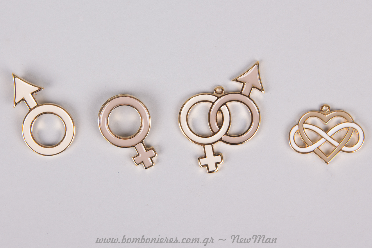Μην σταθείτε μόνο σε ένα διακοσμητικό, αλλά συνδυάστε περισσότερα κι αφήστε τους καλεσμένους σας να διαλέξουν αυτό που προτιμούν. Μεταλλική καρδιά με το σχήμα του απείρου, σύμβολο Venus, σύμβολο Aris και σύμβολο Venus και Aris ενωμένα. Όλα σε μια γλυκιά χρυσαφένια απόχρωση με διαφορετικούς τόνους που σε σημεία αγκαλιάζουν μέχρι και το λευκό.