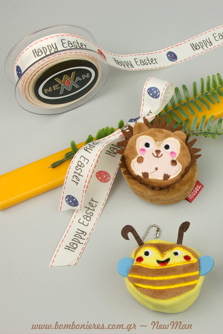DIY πασχαλινή λαμπάδα, διακοσμημένη με χνουδωτά πορτοφολάκια (μελισσούλα, σκαντζόχοιρος) και κορδέλα γκρο «Happy Easter».