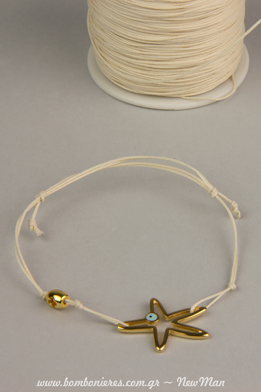 Για τη δημιουργία τους θα χρειαστείτε τα εξής υλικά: κορδόνι λεπτό σε εκρού απόχρωση (0.5mm x 100m), περίγραμμα αστερία με μάτι (24κ Χρυσό) και μεταλλικό σταυρό με κενό σε οβάλ σχήμα και χρυσαφί απόχρωση (5 x 7mm).