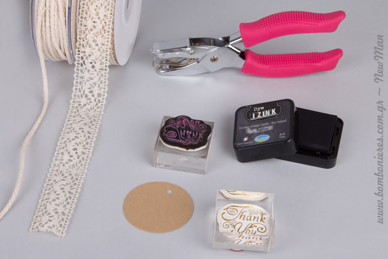 Για τη δημιουργία της θα χρειαστείτε μεταξύ άλλων: εργαλείο perfo pince (3mm), χάρτινες ετικέτες Eco Brown, σφραγίδα διάφανη Thank you και ταμπόν Dye Izink Reglisse. Ετικέτες Eco Brown (στρογγυλές), σφραγίδα διάφανη με ευχαριστήριο μήνυμα και ταμπόν Dye Izink Reglisse.