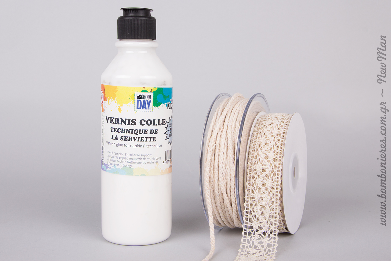 Χωρίστε τη διαδικασία σε τρεις φάσεις: α) φτιάξτε τα καπάκια με τη μέθοδο ντεκουπάζ, β) ανοίξτε με το Perfo Pince τις τρυπούλες που θα χρειαστούν για να περάσετε το κορδόνι Picolino Modo, δημιουργώντας έτσι τη ψευδαίσθηση της μίνι καπελιέρας, περνώντας παράλληλα τη χάρτινη ετικέτα με το ευχαριστήριο μήνυμα, γ) ολοκληρώστε τη σύνθεση τοποθετώντας περιμετρικά του κουτιού κορδέλα δαντέλα.