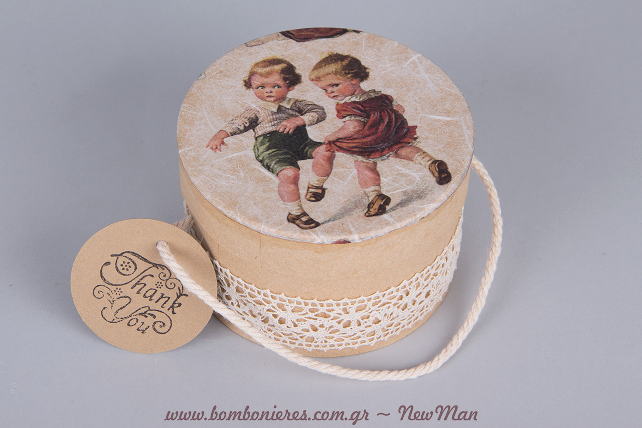 Για τη δημιουργία της θα χρειαστούμε τα εξής υλικά: χάρτινα κουτιά (φ. 10cm), ρυζόχαρτο Α4 με σχέδια, κόλλα για χαρτοπετσέτες, κορδέλα δαντέλα, κορδόνι Picolino Modo, ετικέτες Eco Brown (στρογγυλές), σφραγίδα Thank you (διάφανη), ταμπόν Dye Izink Reglisse και Perfo Pince (εργαλείο).