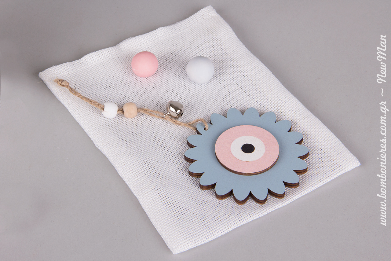 DIY συμβολική μπομπονιέρα βάπτισης σε λευκό πουγκί (καμβάς) με ξύλινο λουλουδένιο μάτι σε παστέλ αποχρώσεις (ροζ-γαλάζιο).