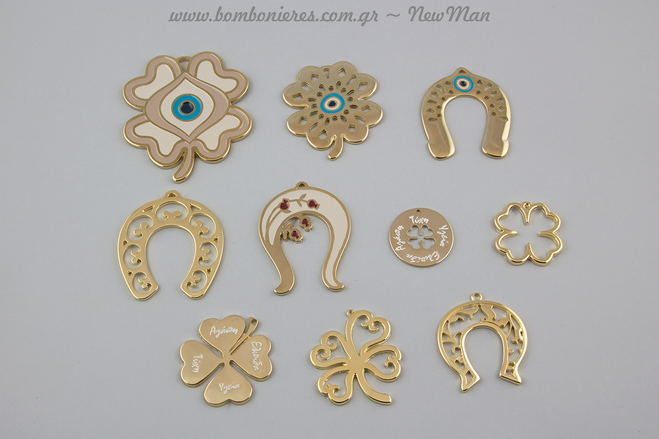 Το πέταλο και το τετράφυλλο τριφύλλι, δύο από τα πιο ευοίωνα σύμβολα, θεωρείται ότι ξορκίζουν την κακοδαιμονία και προσελκύουν τύχη. Όπως βλέπετε και στις φωτογραφίες, στο κατάστημά μας, Θησέως 10, Σύνταγμα θα βρείτε μια ποικιλία διαφορετικών σχεδίων: τετράφυλλο τριφύλλι με σμάλτο και μάτι στο κέντρο (688352), τετράφυλλο μεταλλικό σε χρυσαφί απόχρωση και μάτι (688350), πέταλο με μάτι (688348), πέταλο με σμάλτο και λουλουδάκια (688328) κα. για να διαλέξετε τα δικά σας τυχερά διακοσμητικά.