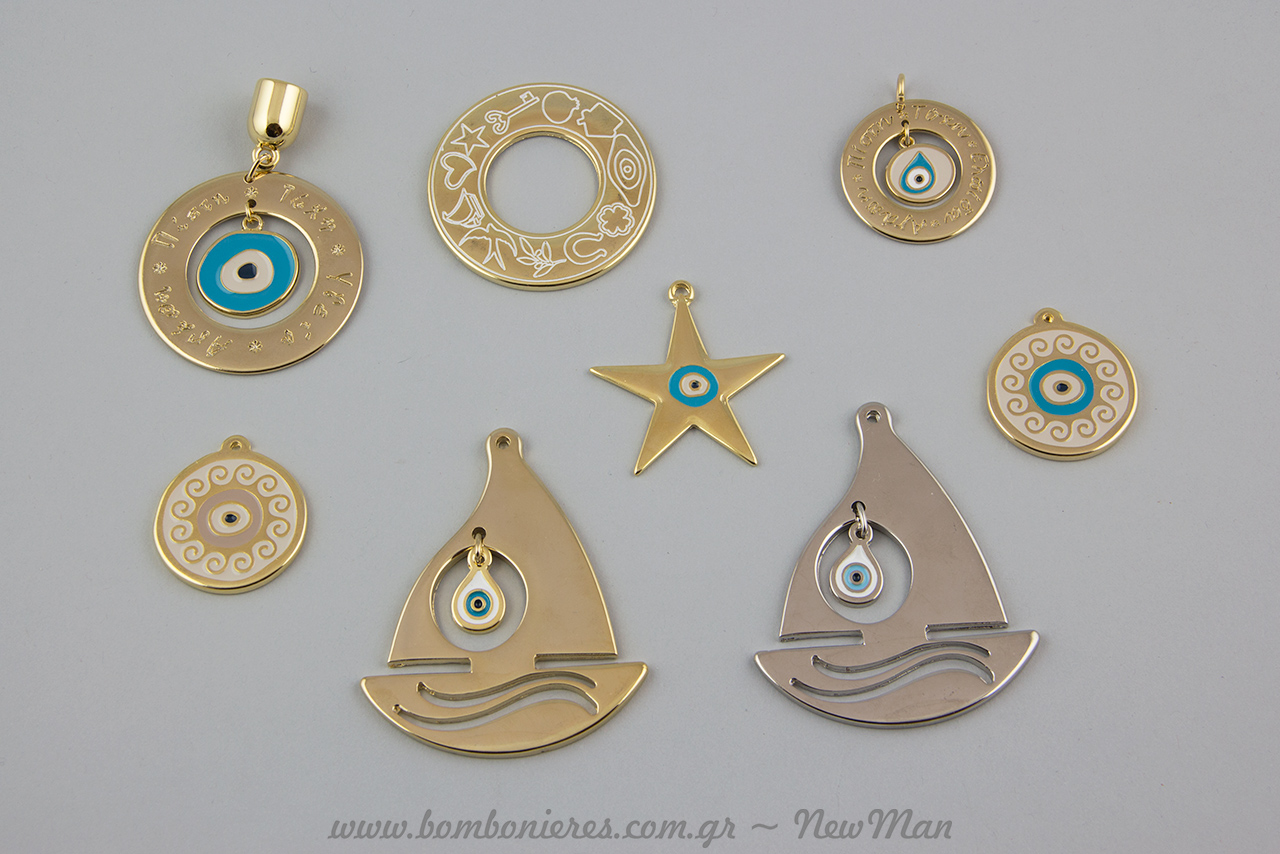 Το μάτι εκτός από τις συμβολικές του προεκτάσεις είναι κι ένα υπέροχο διακοσμητικό στοιχείο. Το βλέπουμε συχνά σε βαπτίσεις, γάμους ή σε δώρα για νεογέννητα. Δεν υπήρχε περίπτωση να μην το χρησιμοποιήσουμε και στα γούρια μας. Όλα τα παρακάτω μεταλλικά μας διακοσμητικά εκτός από το χρυσαφί κύκλο της Τύχης (688331), το αναδεικνύουν σε πρωταγωνιστή: ασημί ή χρυσαφί πλοίο με μάτι (688337), χρυσαφί αστέρι με μάτι (688339), χρυσαφί δίσκος με σμάλτο και μάτι (688336), και χρυσαφί κύκλος με ευχές και μάτι (688213-688295).