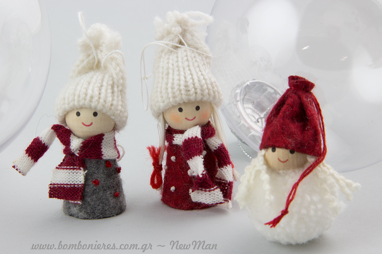 Μπορείτε φυσικά να χρησιμοποιήσετε και μεμονωμένα τα κρεμαστά ανθρωπάκια από τσόχα ή τα υφασμάτινα αγγελάκια με σκούφο ως στολίδια στο χριστουγεννιάτικο δέντρο. Η χρωματική τους γκάμα που κινείται σε γήινες, λευκές, γκρι και κόκκινες αποχρώσεις είναι ιδανική για την χριστουγεννιάτικη ατμόσφαιρα.