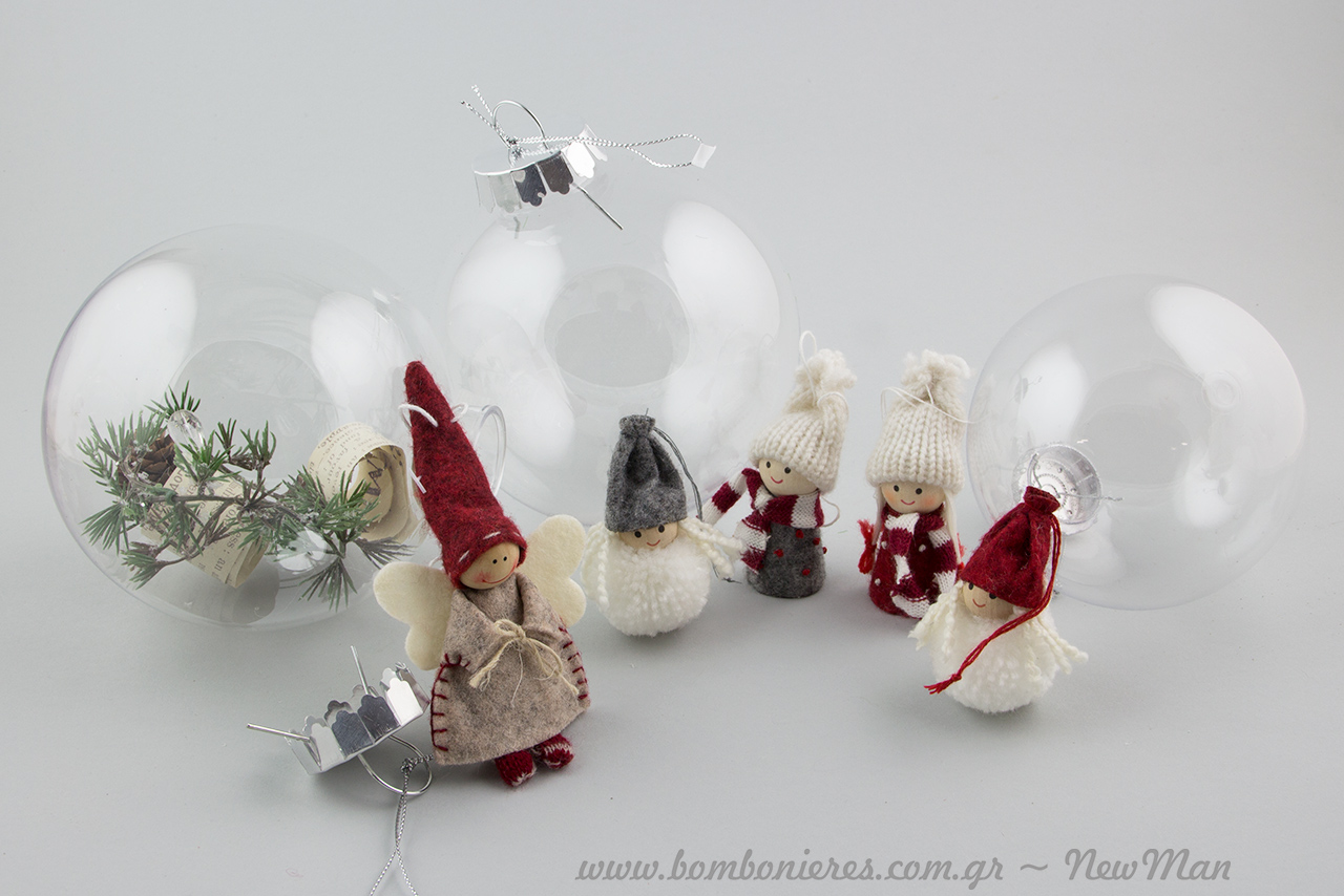 Οι διάφανες Pop Ball, σε δυο διαστάσεις, ανοίγουν εύκολα και χωράνε αρκετούς χριστουγεννιάτικους θησαυρούς όπως τα ανθρωπάκια από τσόχα (6-8cm) και τα υφασμάτινα αγγελάκια με σκούφο. Συμπληρώστε τη σύνθεση με πρασινάδες, κουκουναράκια και διακοσμητικό χιόνι.
