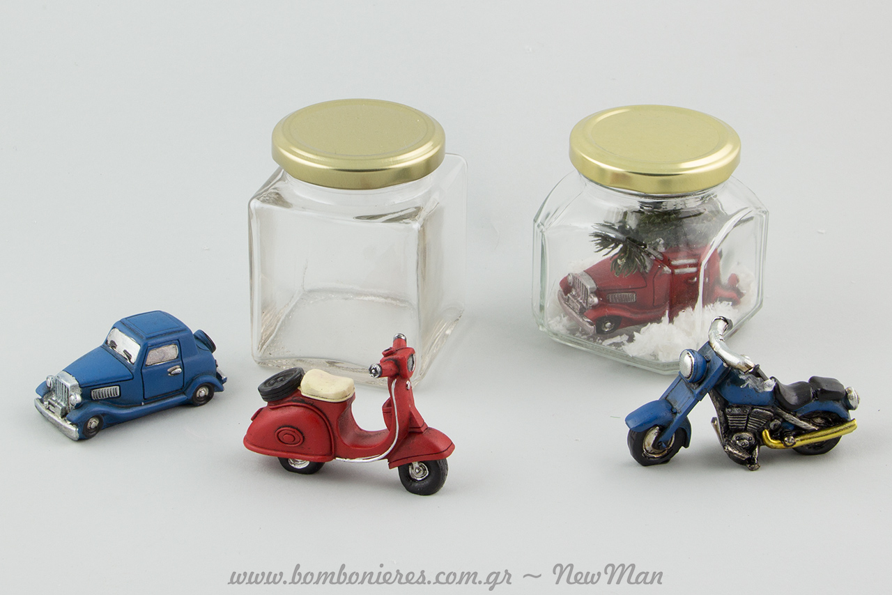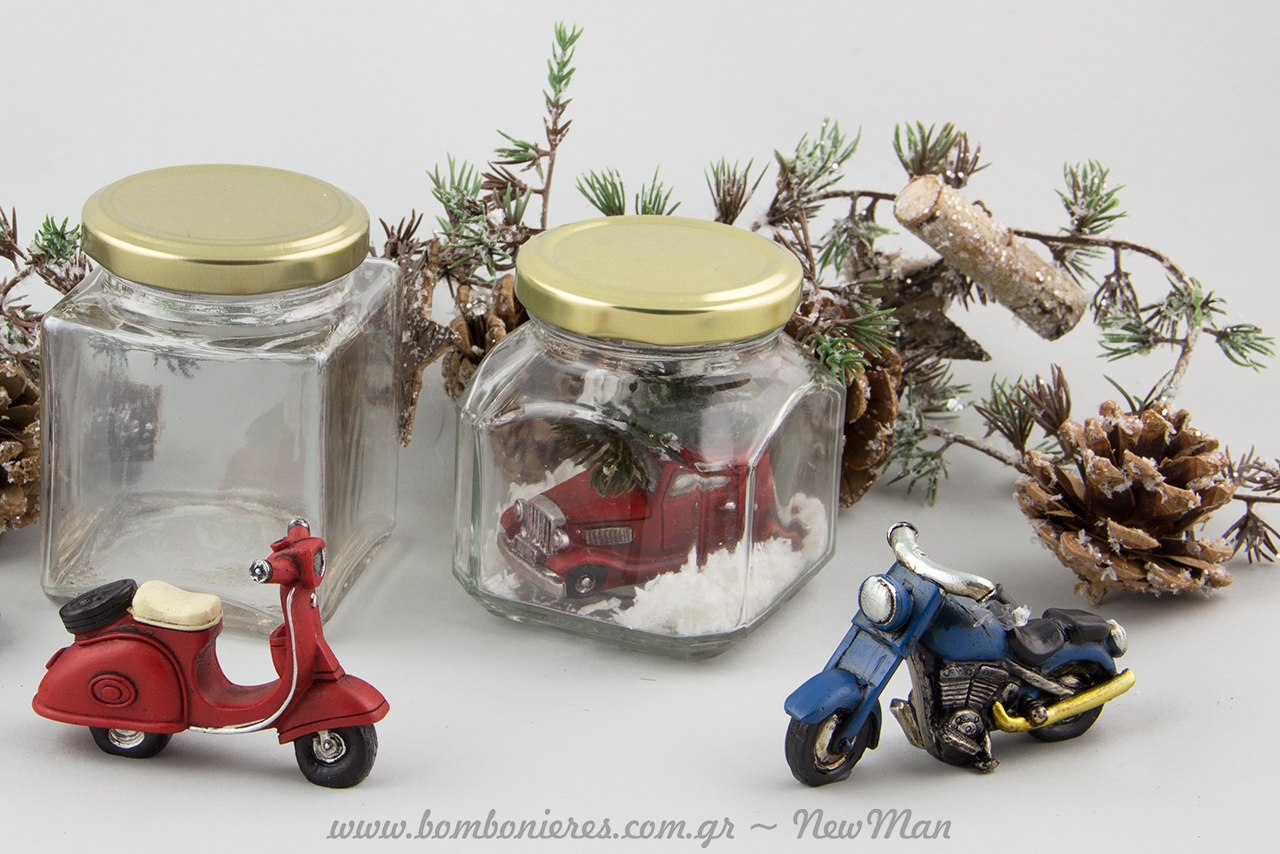 Μια ιδέα που θα ξετρελάνει ειδικά τα αγόρια είναι οι μινιατούρες σε βάζο. Γιατί πέραν των κλασικών επιλογών, αγγελάκια, ξωτικά κα. οτιδήποτε διαλέξουμε μπορεί να πάρει την χριστουγεννιάτικη χροιά που επιθυμούμε. Όπως οι πολυεστερικές μας μινιατούρες: αυτοκινητάκι (μπλε ή κόκκινο), μηχανή και βέσπα. Εμείς κλείσαμε τις μινιατούρες σε γυάλινο βάζο και προσθέσαμε λίγο διακοσμητικό χριστουγεννιάτικο χιόνι για το χειμωνιάτικο εφέ.