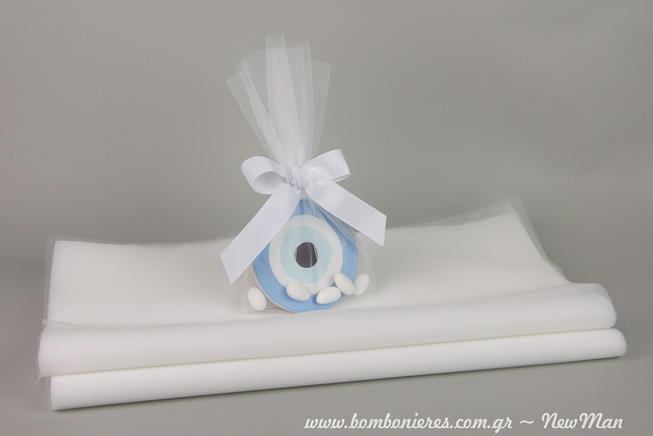 Τα υλικά που θα χρειαστούμε για την τούλινη εκδοχή της μπομπονιέρας με μάτι είναι τα εξής: στρογγυλά σουβέρ μάτι, κορδέλα Gros, λευκό γαλλικό τούλι (50 x 50cm) και κουφέτα Χατζηγιαννάκης Αμυγδάλου Supreme Καραμέλα.