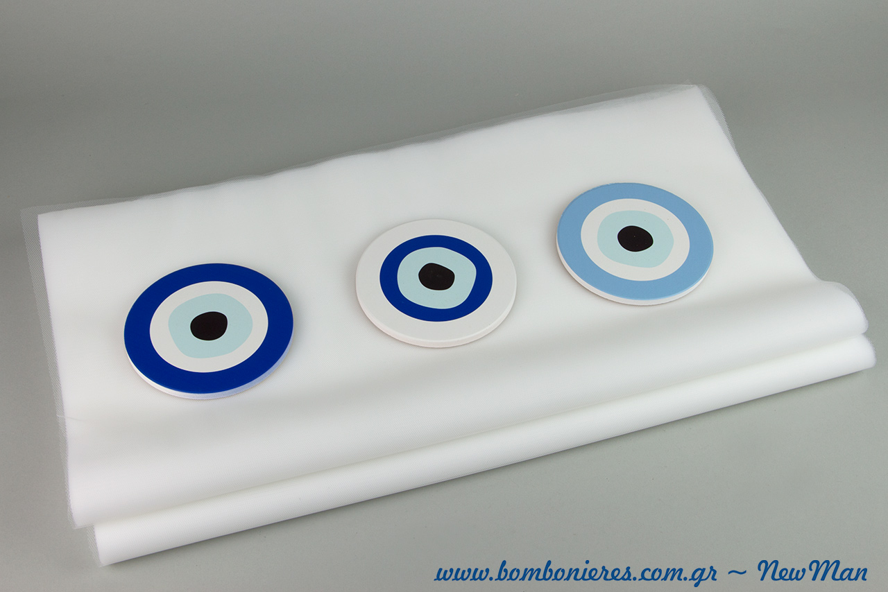 Τα υπέροχα πορσελάνινα σουβέρ με σχέδιο μάτι, είναι πανέμορφα και ενέπνευσαν τη Λίλιαν Νιούμαν να δημιουργήσει δυο διαφορετικές εκδοχές της μπομπονιέρας – φυλαχτού: μία κρεμαστή και μία τούλινη.