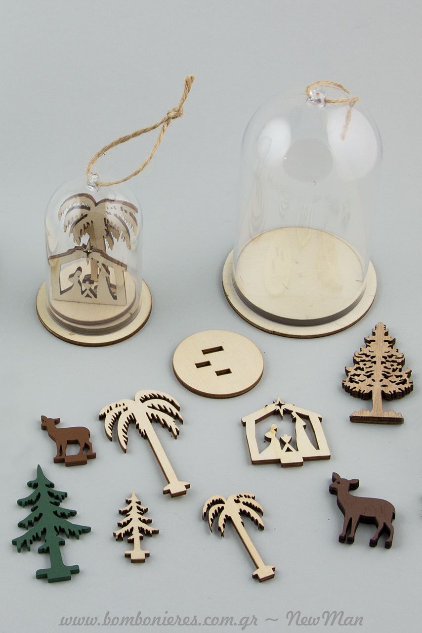 Εμείς διαλέξαμε να διακοσμήσουμε τις καμπάνες με ξύλινες μινιατούρες: έλατο και ελαφάκια (διατίθενται σε συσκευασία των 8 τεμαχίων) και ξύλινες μινιατούρες Xmas 3D (έλατο, τάρανδος, φοίνικας κα.).