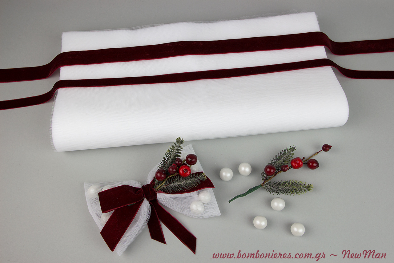 Μια ξεχωριστή δημιουργία της Λίλιαν Νιούμαν, για τη σύνθεση της οποίας θα χρειαστείτε τα εξής υλικά: μπουτουνιέρα γκι (διατίθεται σε συσκευασία των 12 τεμαχίων), βελούδινη κορδέλα με ούγια – φάρδος 15mm και 25mm- σε μπορντό απόχρωση, τούλι γαλλικό (39 x 39cm) και κουφέτα Χατζηγιαννάκης Crispy περλέ λευκό.