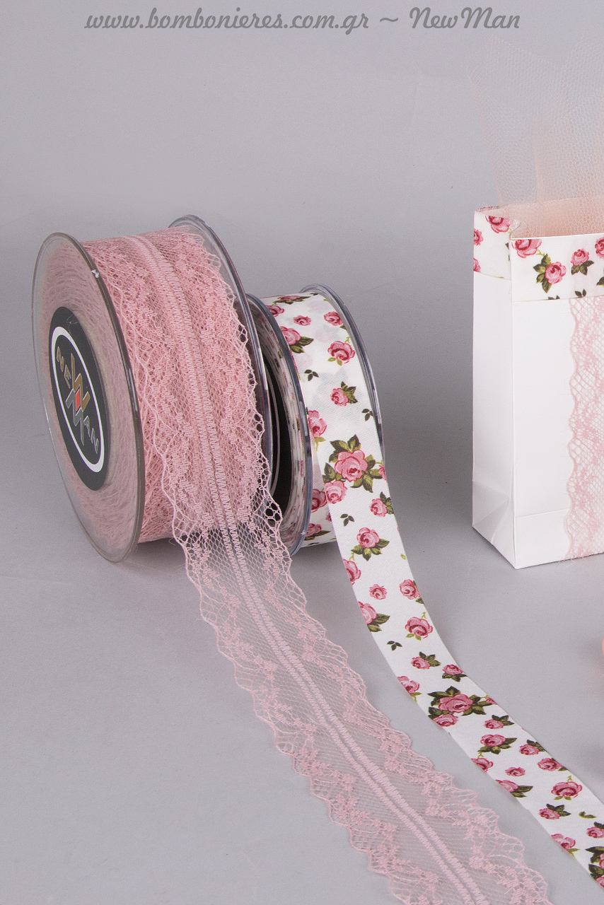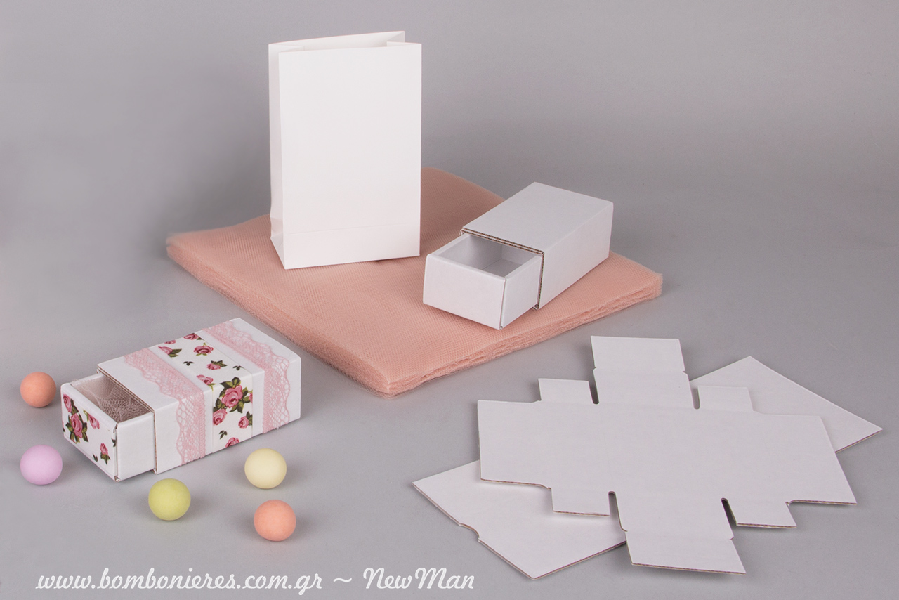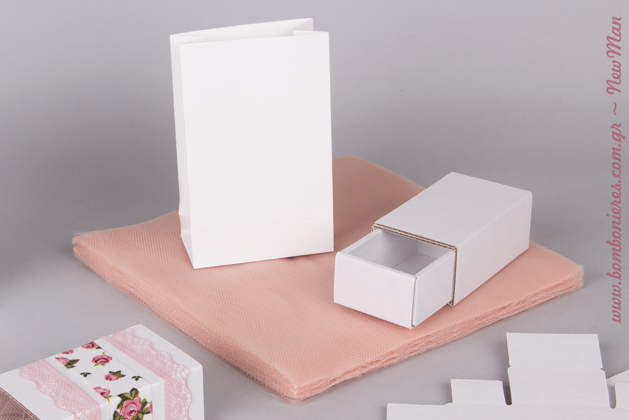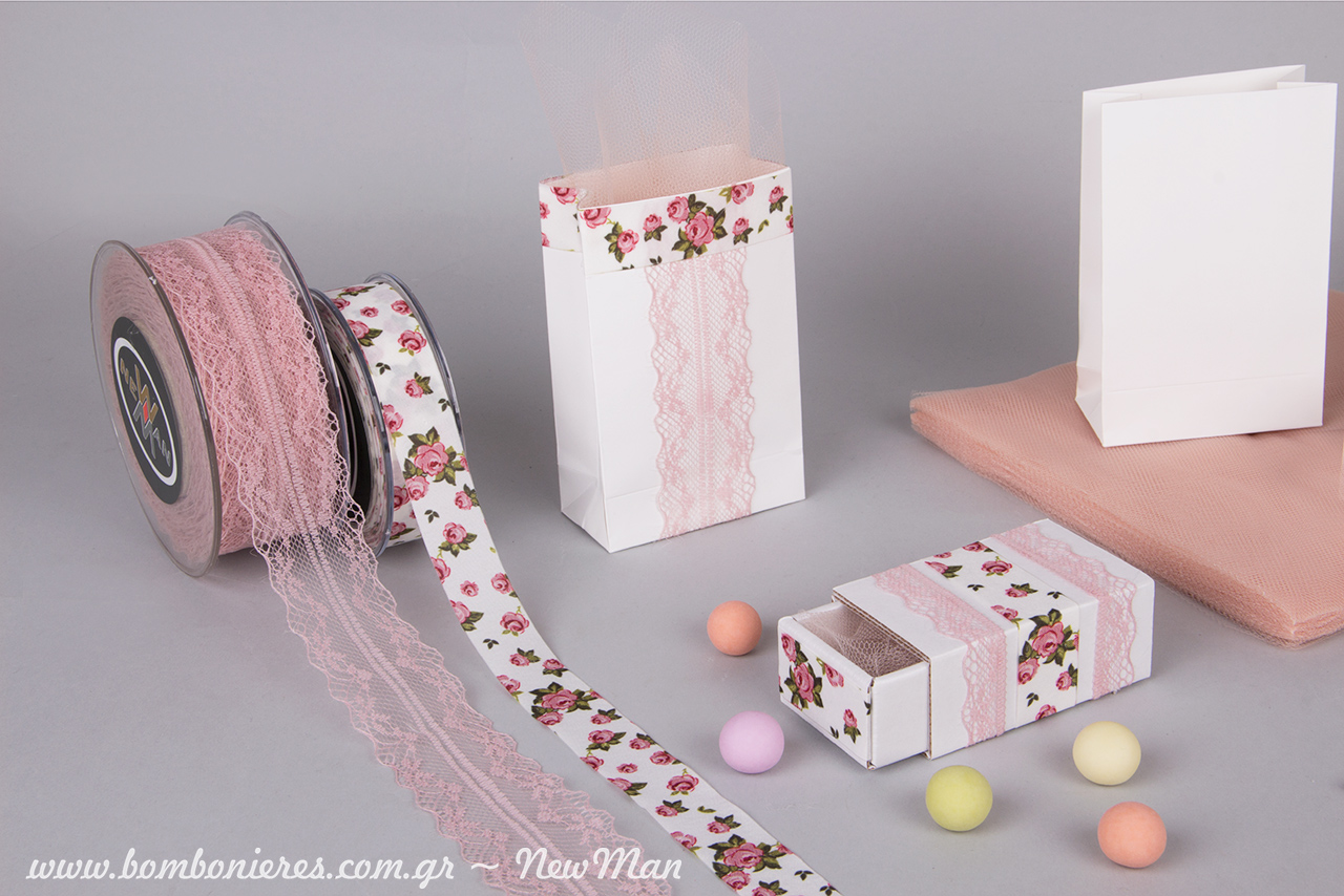 Τα υλικά που θα χρειαστείτε για τη δημιουργία της είναι τα εξής: τσάντα φάκελος σε λευκό 8×12.5x4cm & συρταρωτό κουτί (τύπου σπιρτόκουτο) αποκλειστικής παραγωγής Newman επίσης σε λευκό, κορδέλα- δαντέλα Old- Time-Classic σε παλιό ροζ, κορδέλα υφασμάτινη Rosa Multiflora, τούλι ελληνικό (ροζ) και κουφέτα Χατζηγιαννάκης (εδώ σας προτείνουμε τα Crispy πολύχρωμα).