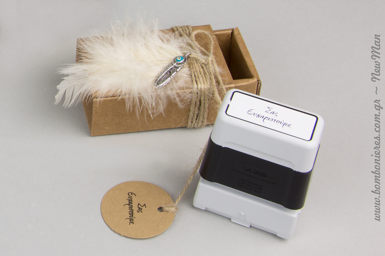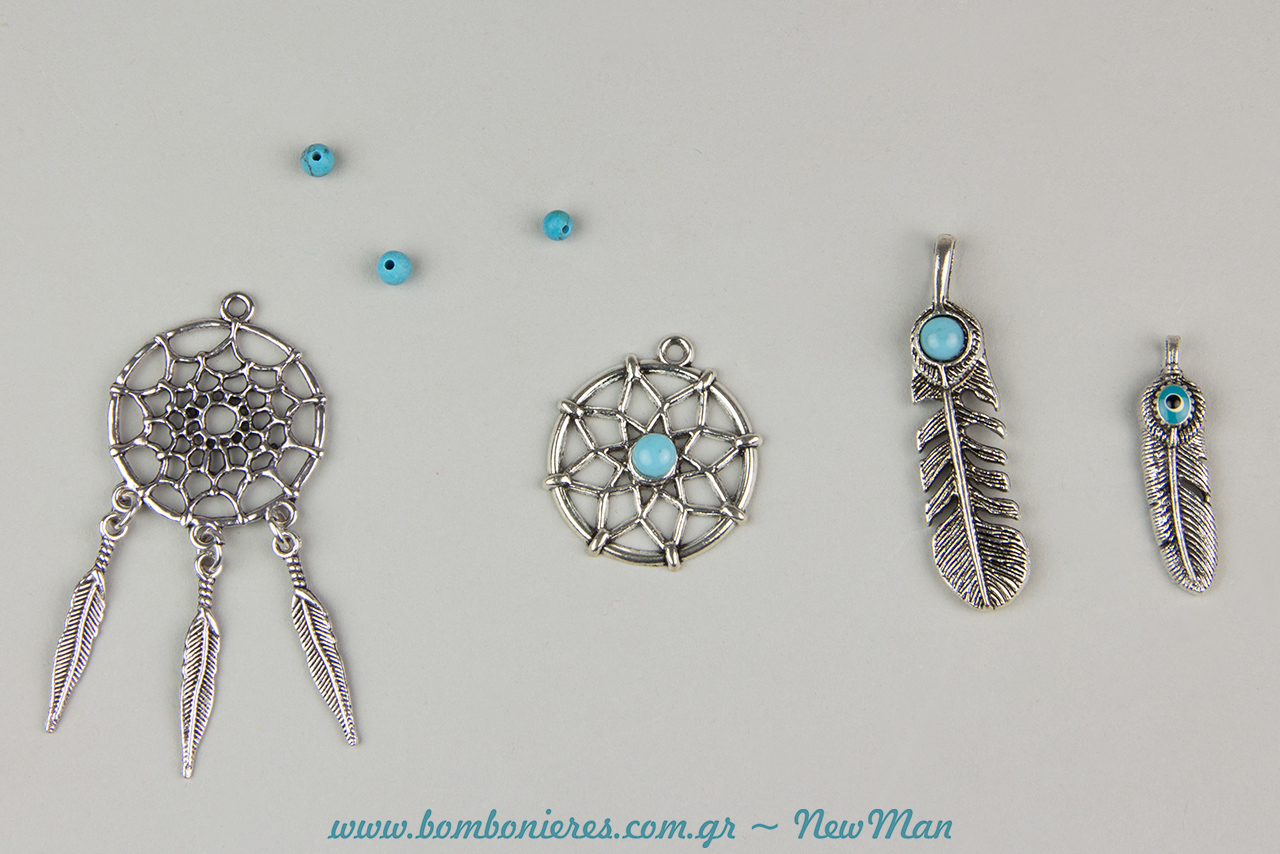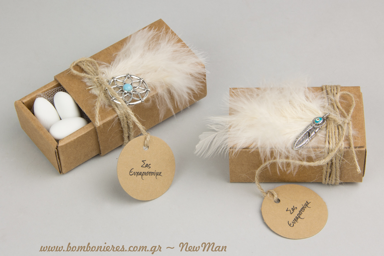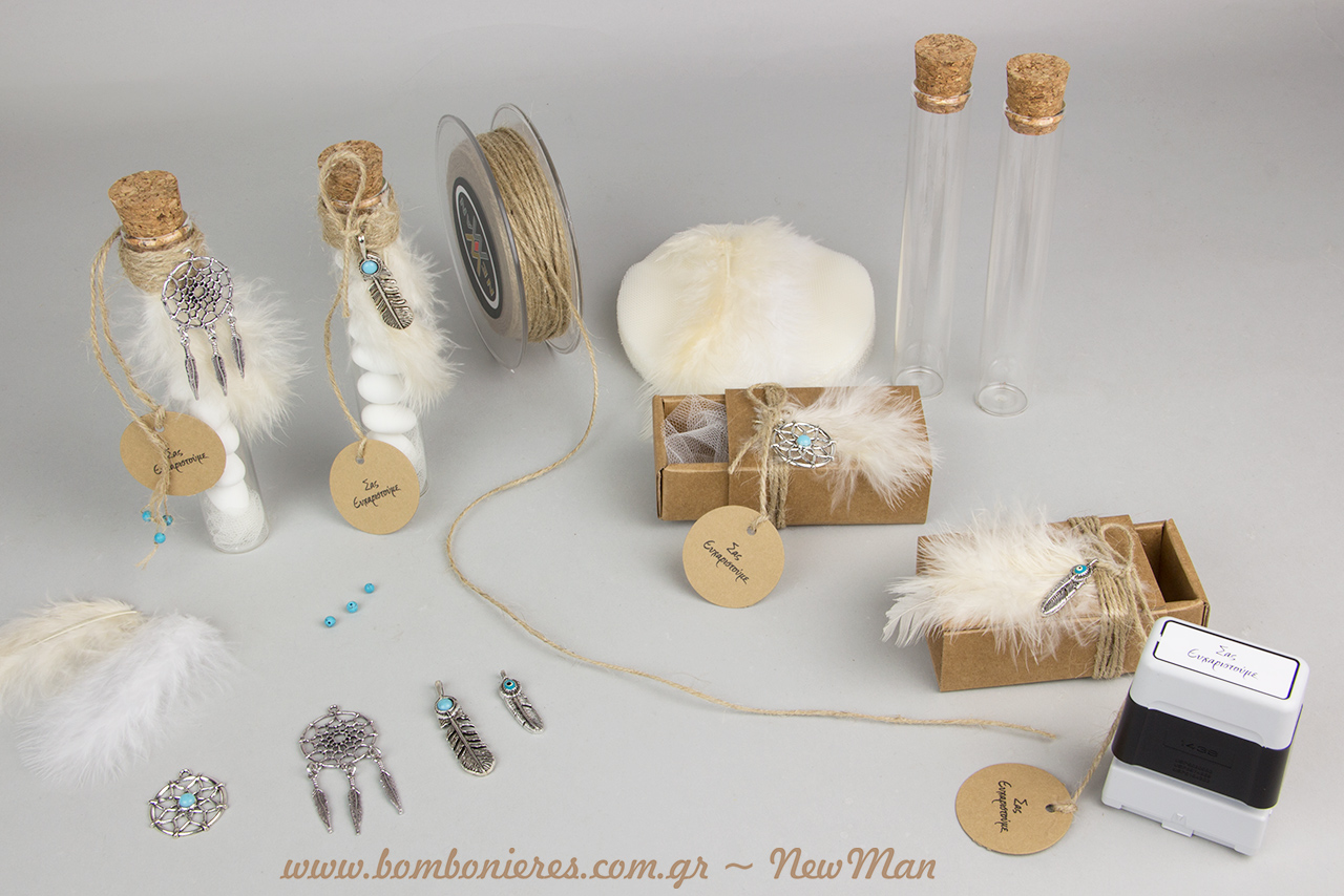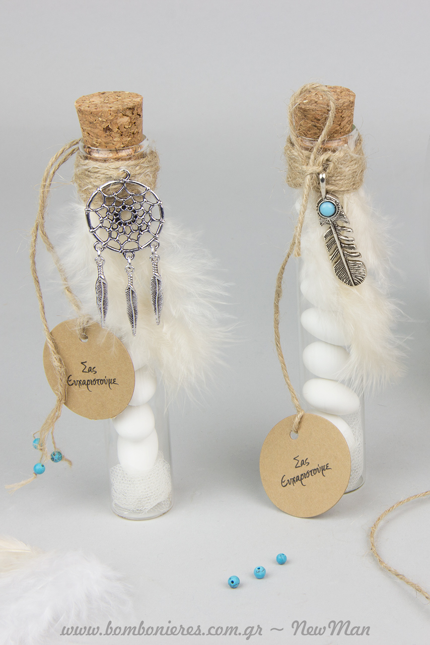Στην πρώτη εκδοχή της boho chic αυτής μπομπονιέρας, συνδυάσαμε τα διακοσμητικά μεταλλικά φτερά και ονειροπαγίδες με γυάλινο δοκιμαστικό σωλήνα και μικρό λευκό πούπουλο. Η σύνθεση ολοκληρώθηκε με κορδόνι γιούτα ψιλό, τούλι ελληνικό, κουφέτα Χατζηγιαννάκης, χάντρες Magnesite Turg. σε σιέλ και ετικέτες Eco Brown με ευχαριστήριο μήνυμα.