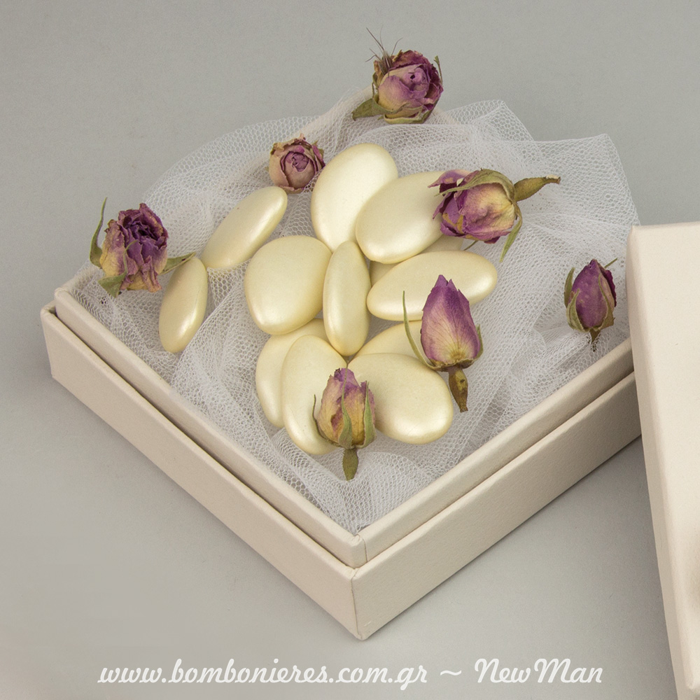 Η μπομπονιέρα – φθινοπωρινό κουτί είναι μια δημιουργία της Λίλιαν Νιούμαν και για την υλοποίησή της θα χρειαστείτε τα εξής υλικά: σαμπανί, τετράγωνο κουτί, παραγωγής Newman, σατέν κορδέλα διπλής όψης με δίχρωμη ούγια, βουλοκέρι με φιτίλι, σφραγίδα για βουλοκέρι, ελληνικό τούλι σε ανοιχτά χρώματα (25 x 25cm) και κουφέτα Χατζηγιαννάκης Bijoux Supreme περλέ λευκό.