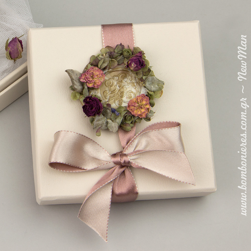 Η σφραγίδα βουλοκέρι με τη vintage γοητεία της και τα αποξηραμένα λουλουδάκια & βότανα προσδίδουν στην αισθητική της μπομπονιέρας τη φινέτσα μιας άλλης εποχής τότε που τα ερωτευμένα ζευγάρια έκαναν ρομαντικούς περιπάτους στη φύση, και κρατούσαν τους θησαυρούς της (ανθάκια), βαθιά στο κουτί της μνήμης τους ως αναμνηστικό των πιο ευτυχισμένων τους στιγμών.