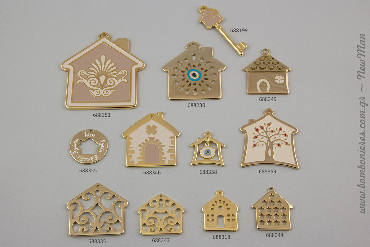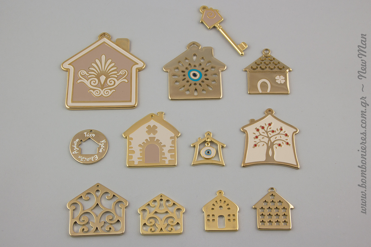 Μεταλλικά διακοσμητικά σπίτια σε διάφορα σχέδια, μεγέθη και χρώματα για να φτιάξετε τα δικά σας καλότυχα γούρια.