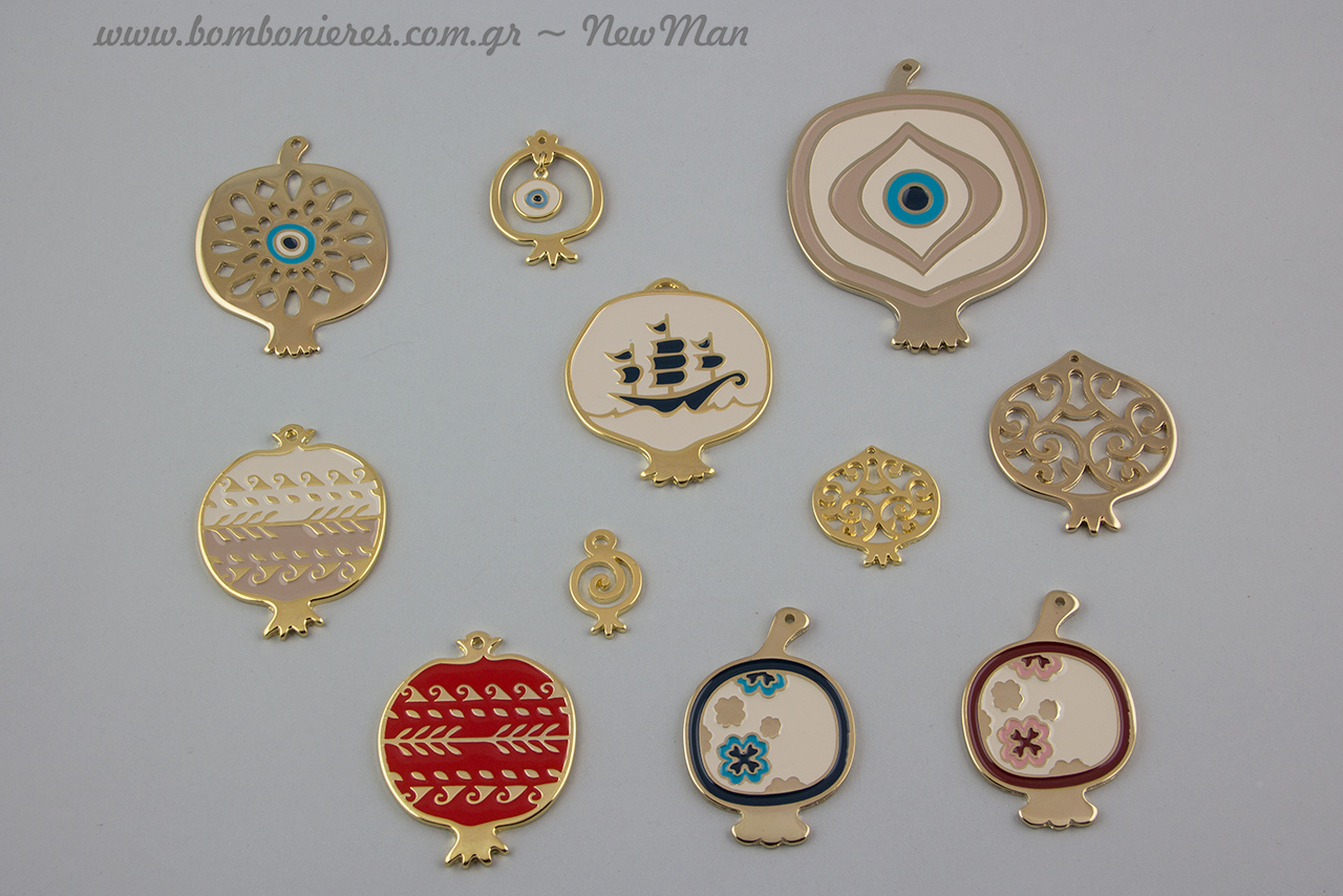 Όπως θα δείτε και στις φωτογραφίες τα ρόδια μας βγαίνουν σε διάφορες εκδοχές, χρώματα, σχέδια και μεγέθη: επισμαλτωμένο σε κόκκινο χρώμα ή εκρού με κυματιστούς σχεδιασμούς, επισμαλτωμένο ρόδι με μάτι ή καράβι, δίχρωμο ρόδι με τριφυλλάκια ή απλό μεταλλικό σε χρυσαφένια απόχρωση κα.
