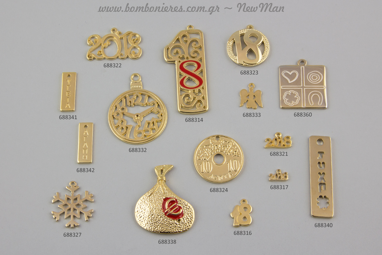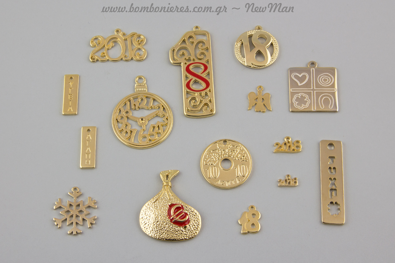 Μεταλλικά διακοσμητικά στοιχεία για γούρια Πρωτοχρονιάτικα, γεμάτα ευχές.