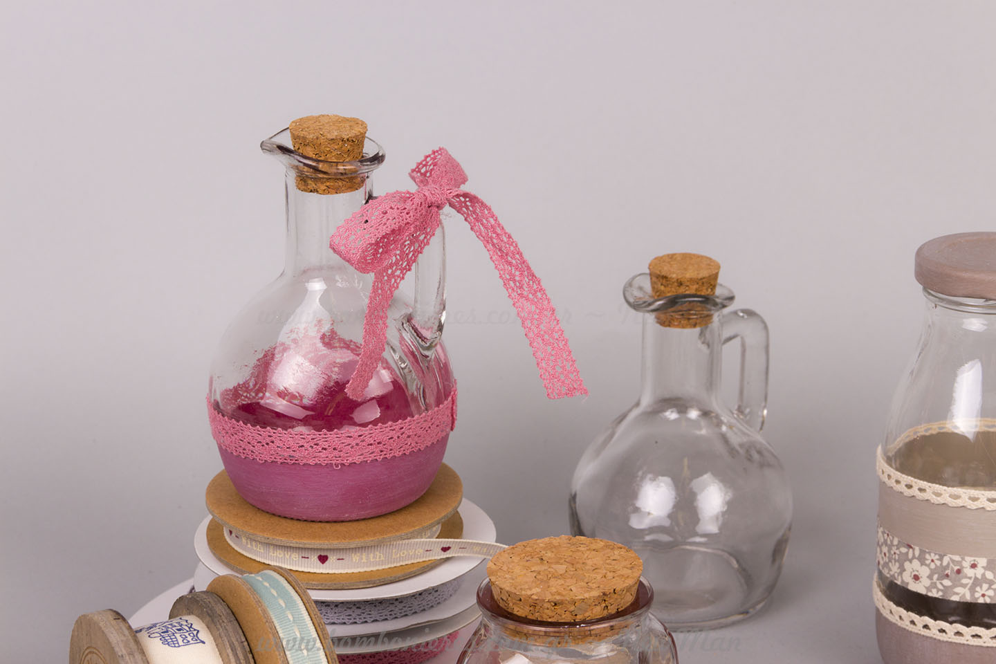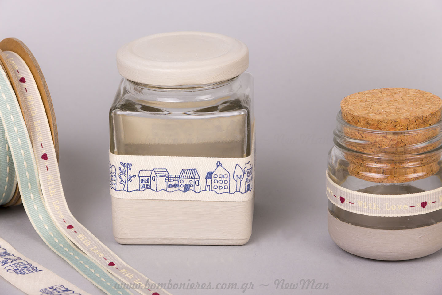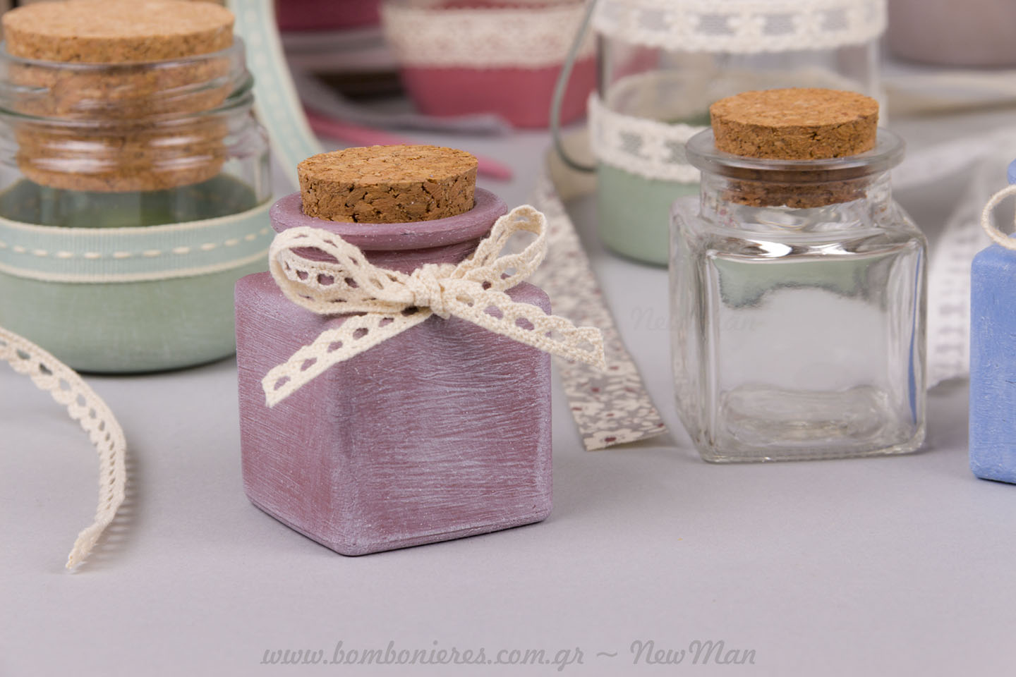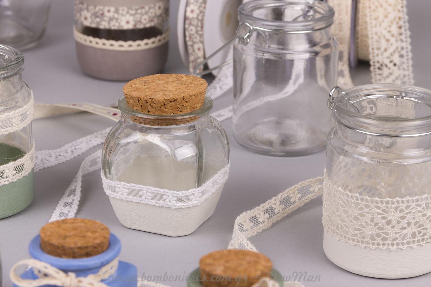 Βάφουμε με chalk paints γυάλινα βαζάκια με φελλό, γυάλινο κανατάκι με φελλό, βαζάκια με μεταλλικά καπάκια και γυάλινα για ρεσώ. Στολίζουμε με κορδέλες και ιδού το αποτέλεσμα!