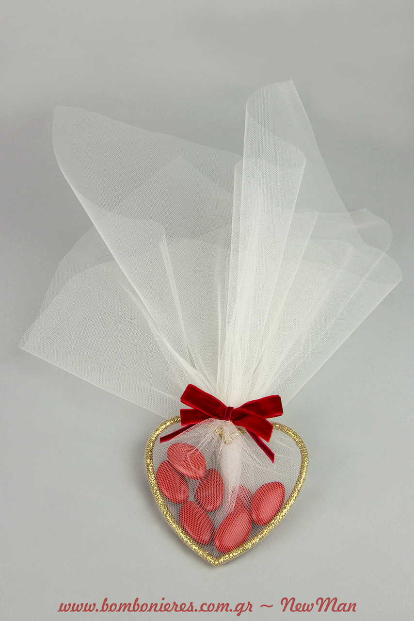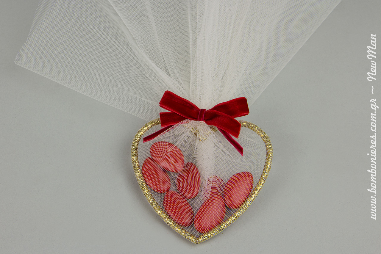 Μπομπονιέρα γάμου σε χρυσή καρδιά με γκλίτερ, συνδυασμένη με βαθυκόκκινες βελούδινες κορδέλες και κουφέτα Χατζηγιαννάκης σε κόκκινη, φλογερή απόχρωση.