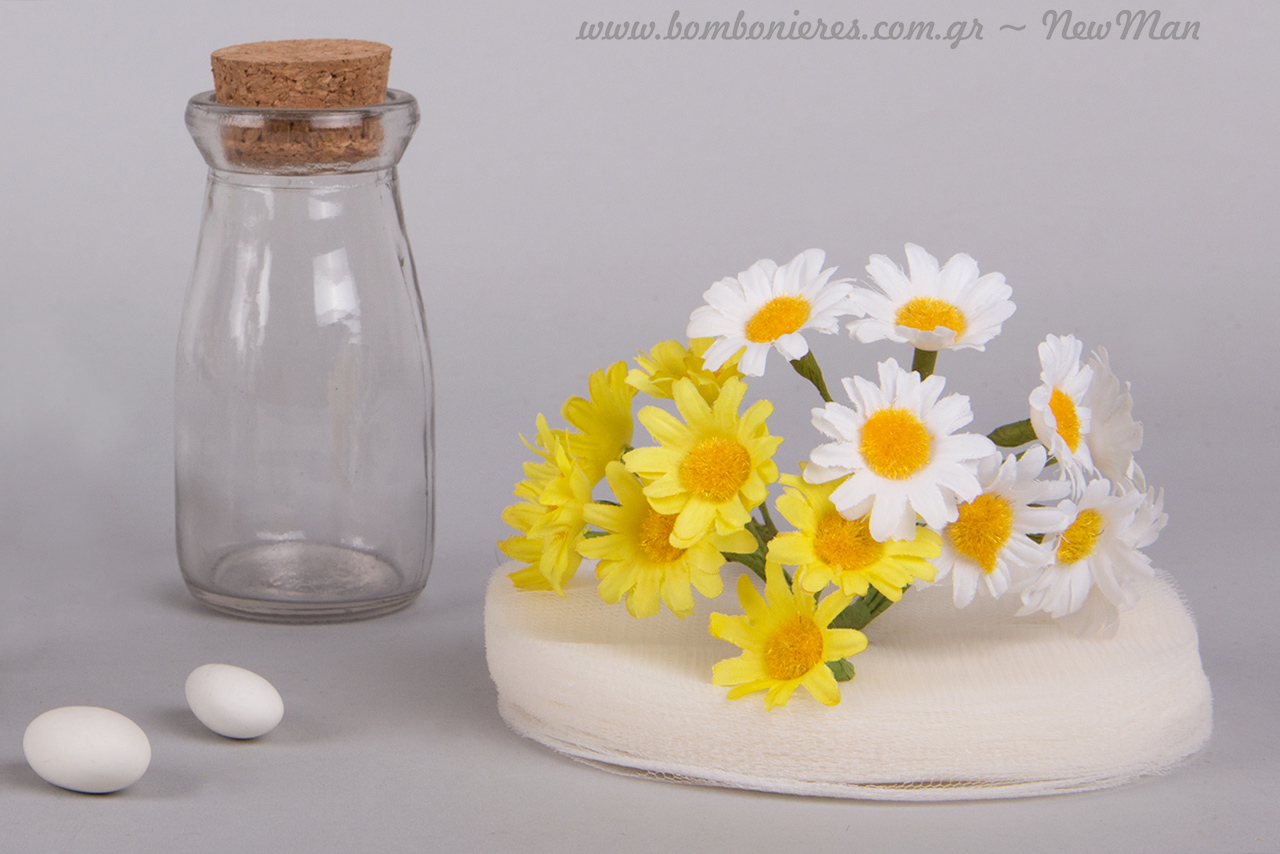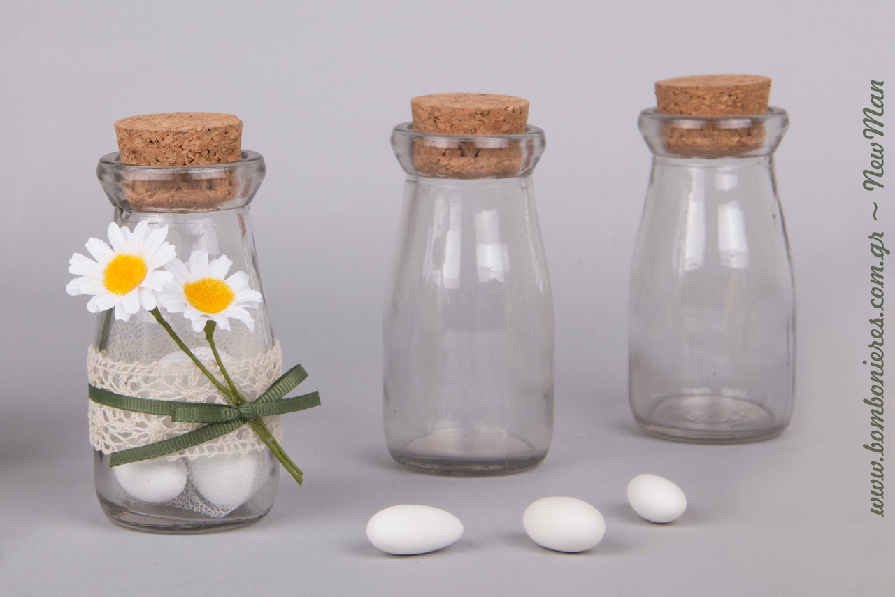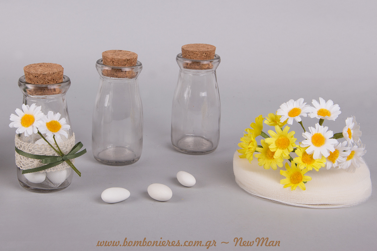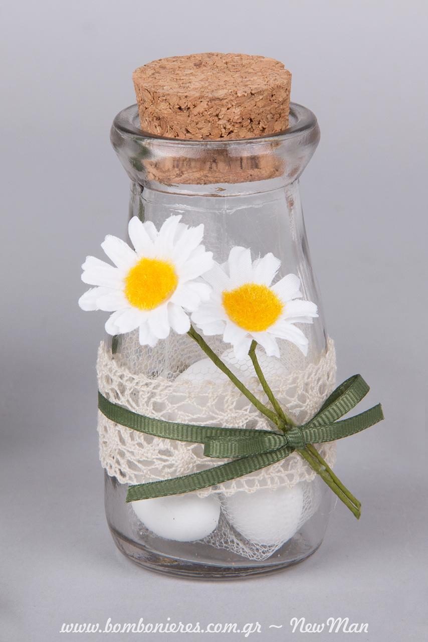 Τη βάση της μπομπονιέρας μας αποτελούν τα γυάλινα βαζάκια με φελλό (95mm x 50mm), τα οποία διακοσμήσαμε με κορδέλα δαντέλα, κορδέλα γκρο σε κυπαρισσί απόχρωση και διακοσμητικές μαργαριτούλες.