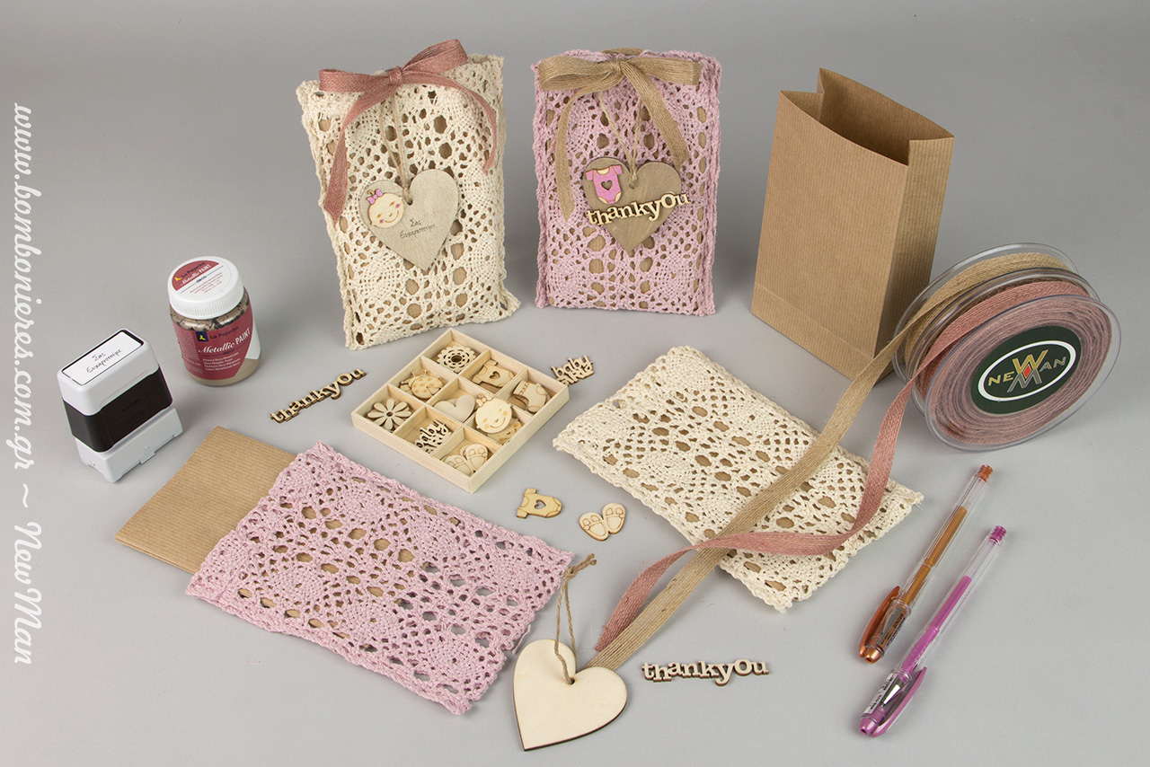 Για τη δημιουργία της ρετρό αυτής μπομπονιέρας σε boho στυλ θα χρειαστείτε τα εξής υλικά: τσάντα φάκελος kraft no1 (9.5 x 16.5cm), δαντελένια πουγκάκια (10 x 17cm), κορδέλα γιούτα, ξύλινη κρεμαστή καρδιά σε φυσική απόχρωση (6cm), ξύλινο σετ 27 τεμαχίων Mini Baby Girl (3cm), Metallic Paint Champagne (75ml), στυλό Noble Metallic ή custom made σφραγίδα Brother με ευχαριστήριο μήνυμα και φυσικά κουφέτα Χατζηγιαννάκης.