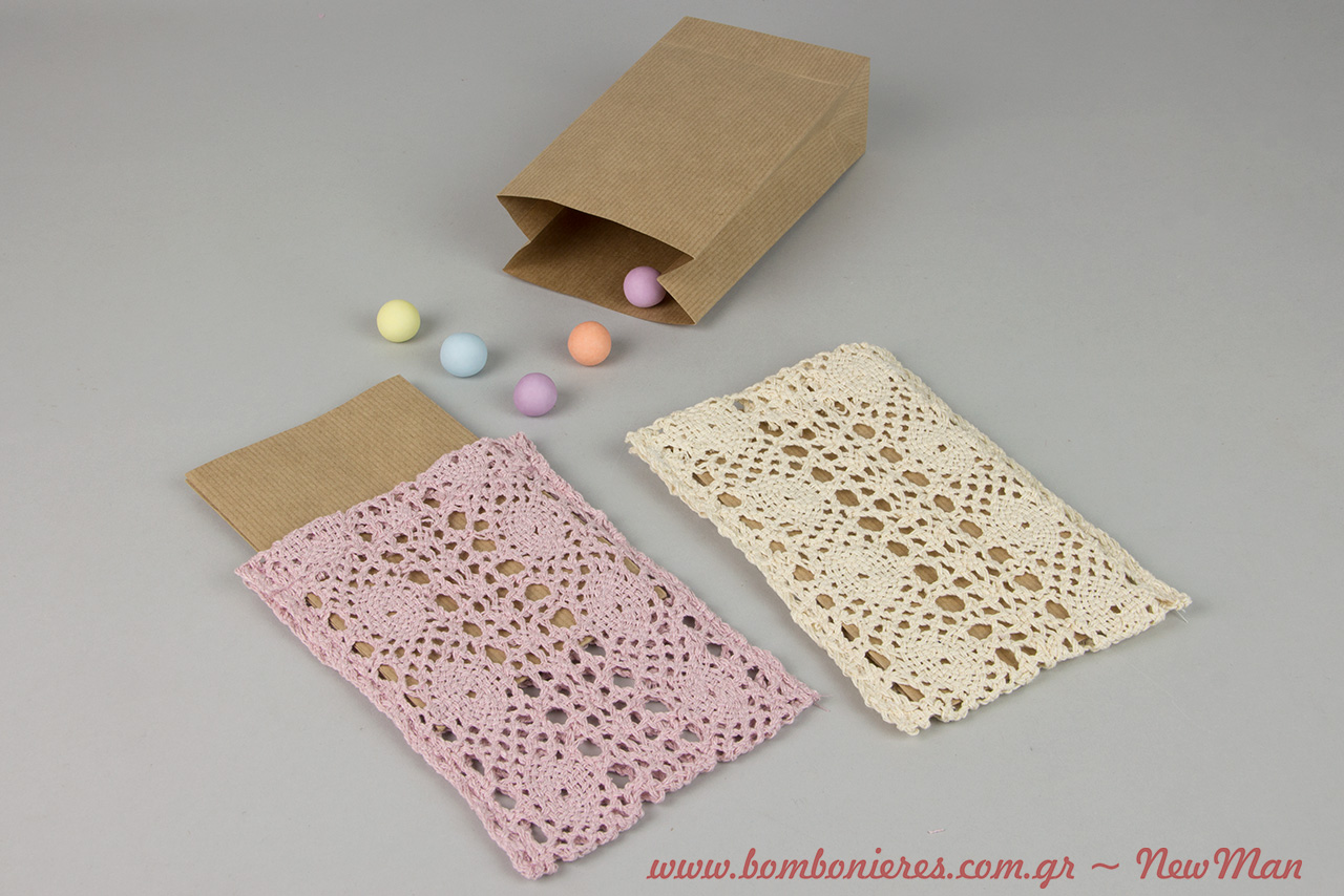 Η σημερινή μας πρόταση για μπομπονιέρα βάπτισης, τιμώντας αυτές τις υπέροχες γυναίκες, τις γιαγιάδες μας, φέρνει το παρελθόν στο σήμερα, χρησιμοποιώντας ως πρώτη ύλη τα δαντελένια πουγκάκια (crochet). Γιατί το μόνο που χρειάζεται η παράδοση για να μας θυμίσει όλα αυτά τα πλεγμένα μέτρα από νήματα (σεμεδάκια, σεντόνια, τραπεζόμαντιλα), είναι ένα cool update.