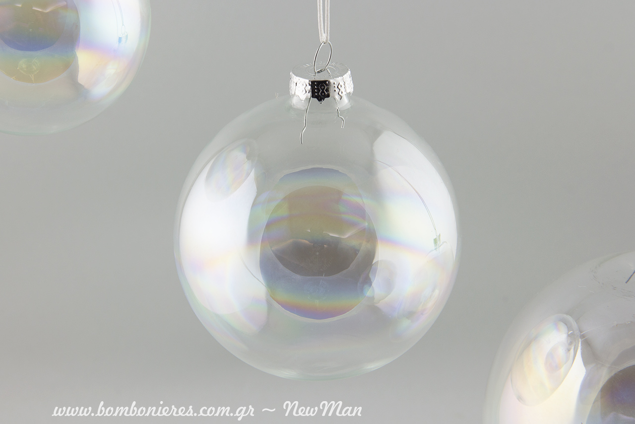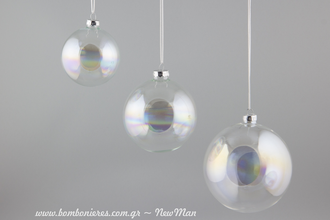Γυάλινες ιριδίζουσες διάφανες μπάλες σε τρία διαφορετικά μεγέθη (8cm, 10cm και 12cm) για μια μίνιμαλ χριστουγεννιάτικη διακόσμηση που θα σας βοηθήσει να αποφύγετε τις υπερβολές και να δημιουργήσετε τον πιο κομψό στολισμό ever!
