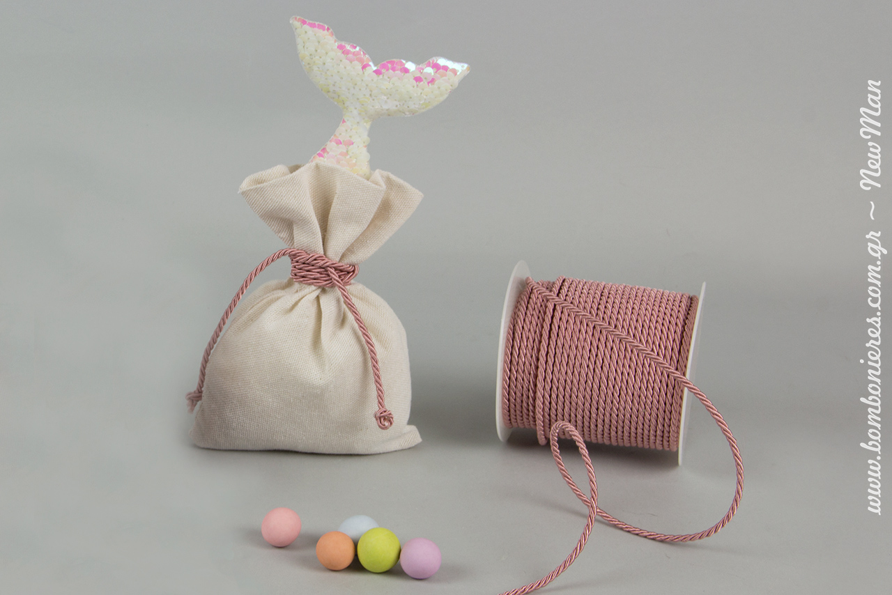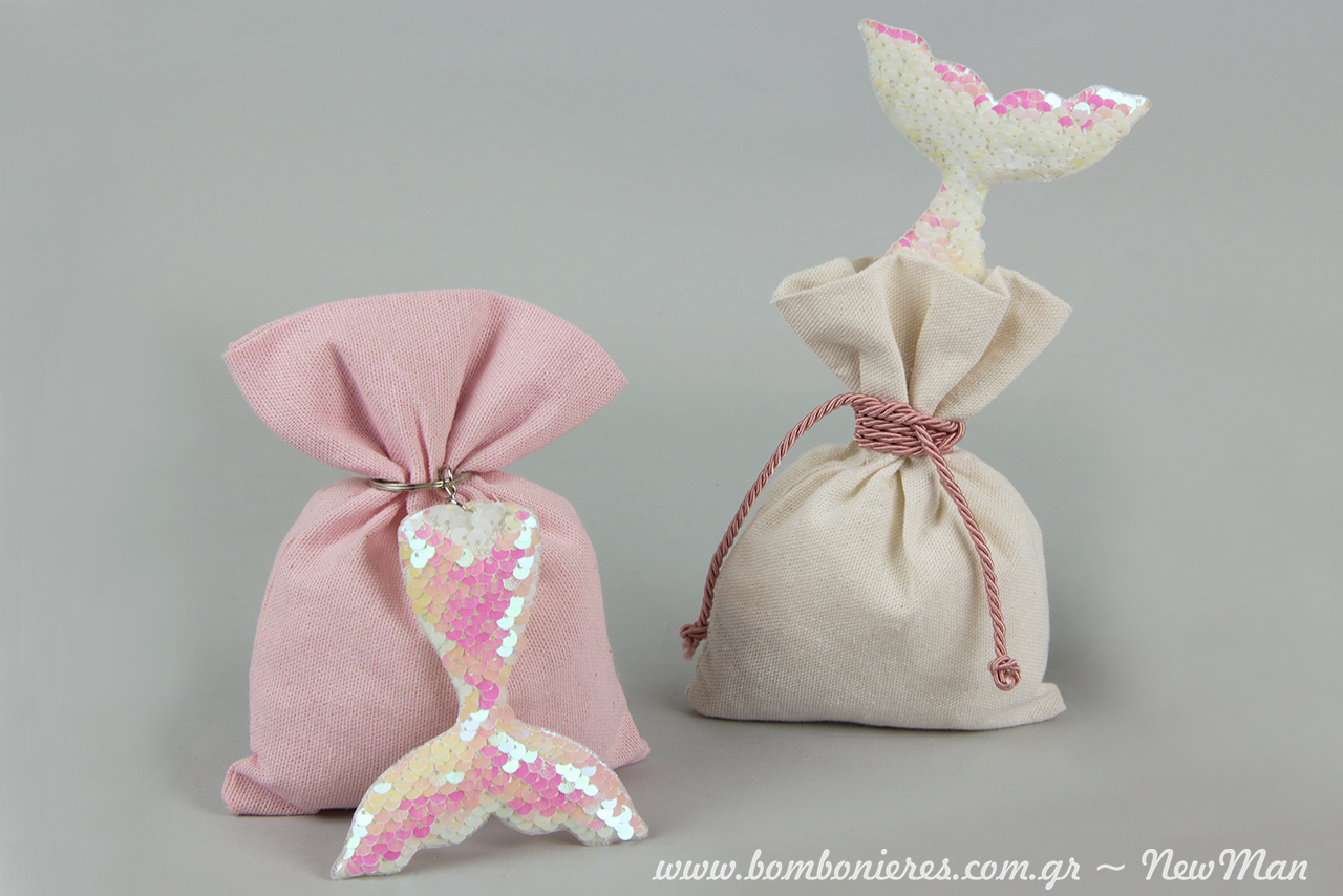 Όπως θα δείτε και στις φωτογραφίες προτείνουμε δυο εξίσου εντυπωσιακές εκδοχές της μπομπονιέρας-γοργόνας: η μία είναι σε ροζ υφασμάτινο πουγκάκι, το οποίο έχουμε κλείσει με ουρά γοργόνας (ροζ) χρησιμοποιώντας τον κρίκο του μπρελόκ και η άλλη είναι σε εκρού πουγκί, το οποίο έχουμε κλείσει με ροζ κορδόνι τρικλ, στερεώνοντας την ουρά-μπρελόκ (λευκό) στην κορυφή του πουγκιού.