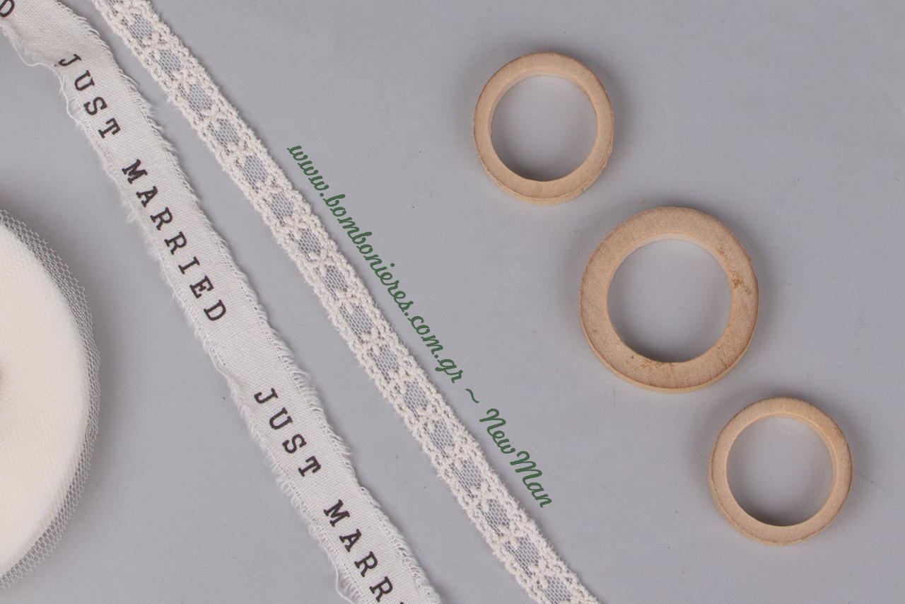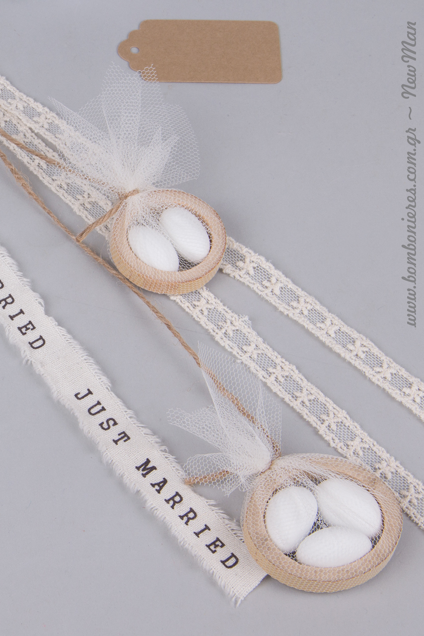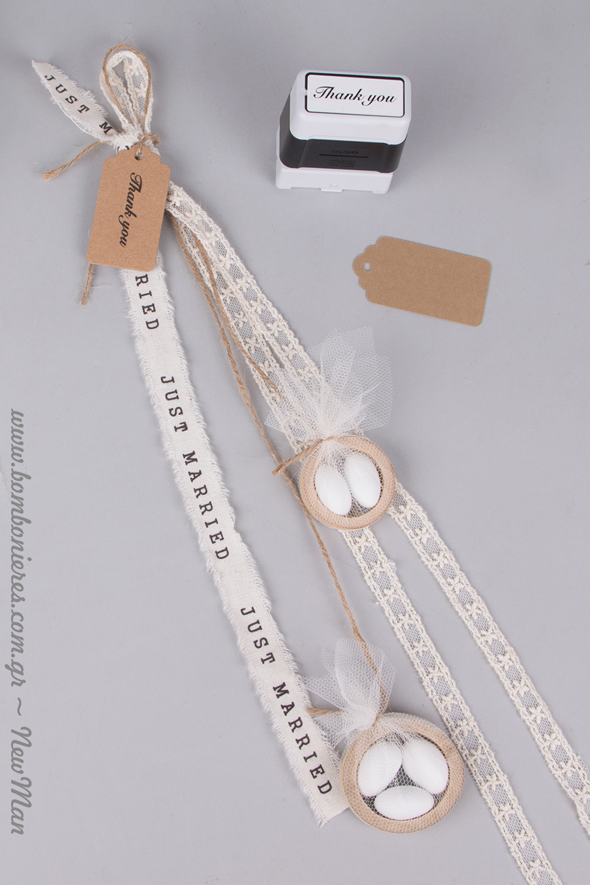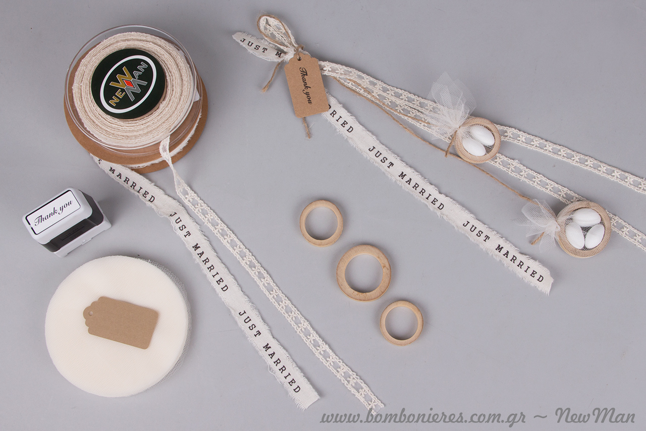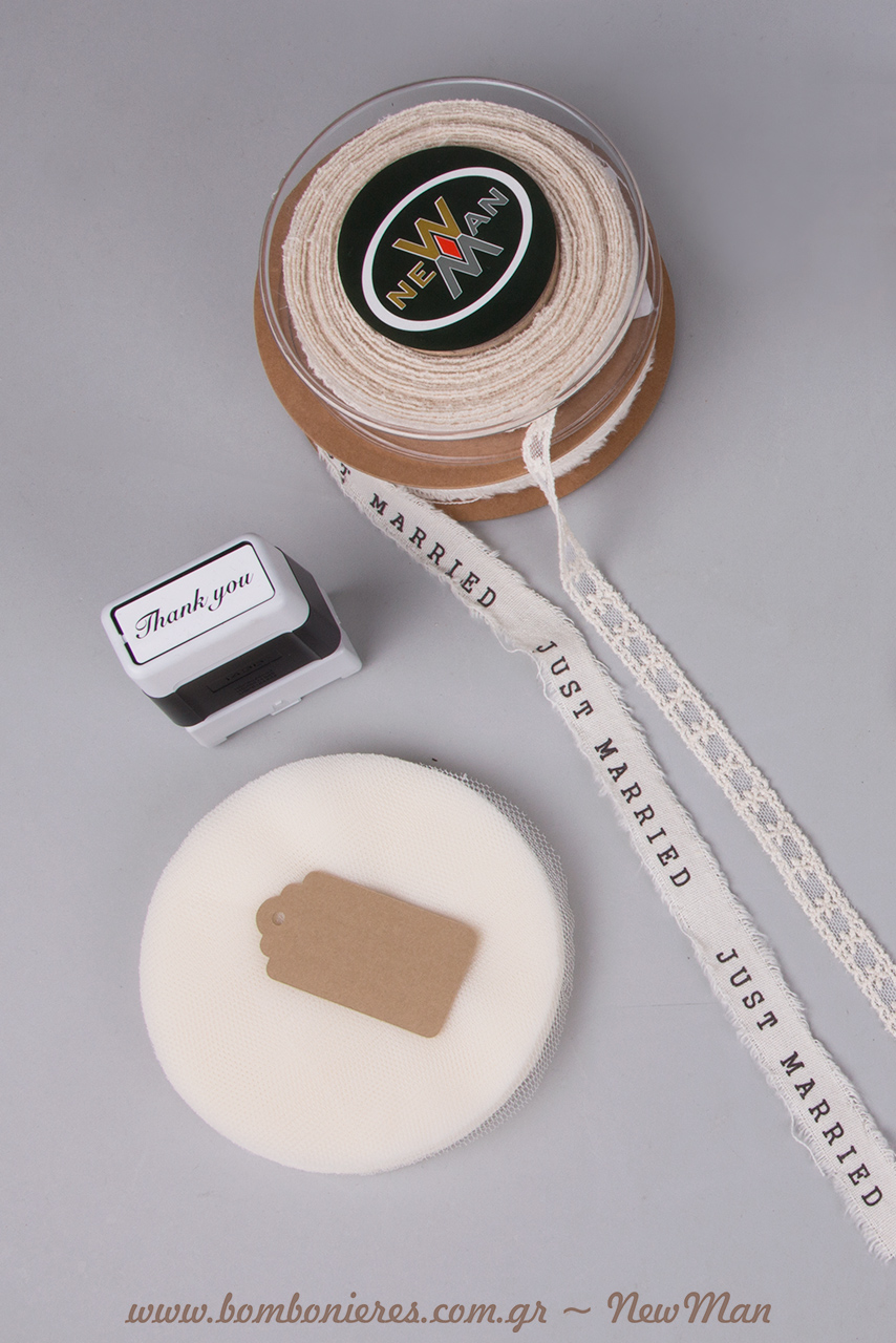 Tip 3: Χρησιμοποιήστε διπλό το φυτίλι (κέντημα σε τούλι) αφήνοντας του λίγο περισσότερο μήκος σε σχέση με την κορδέλα Just Married, την οποία θα εντάξετε στη σύνθεση μονή.