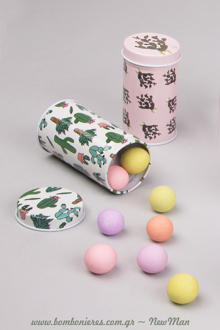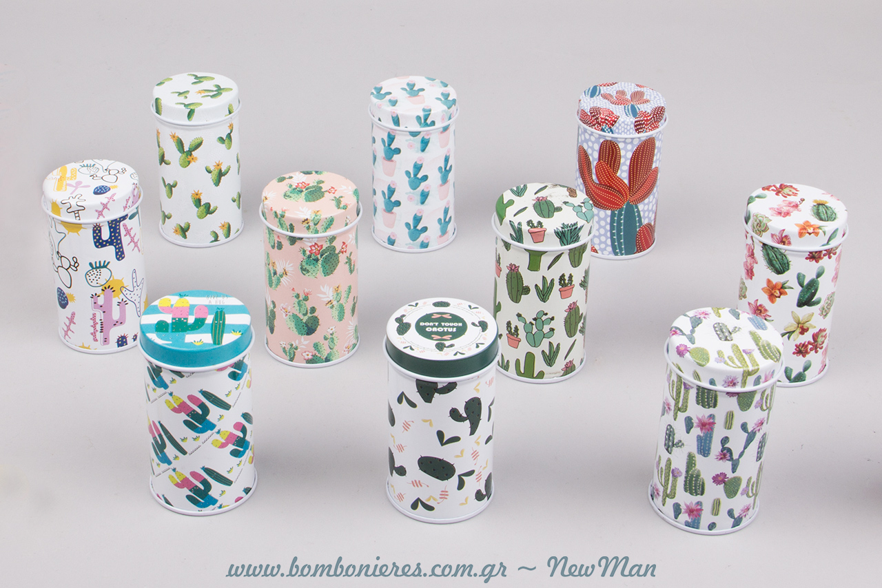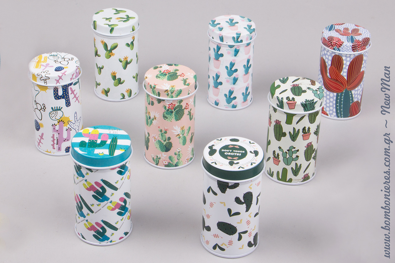 Σε 12 υπέροχα διαφορετικά σχέδια και χρώματα τα μεταλλικά κυλινδρικά κουτάκια-κακτάκια θα ενθουσιάσουν με τη φρεσκάδα τους, ενώ μπορούν άνετα να χρησιμοποιηθούν/δοθούν και ως αναμνηστικά δωράκια γεμάτα καραμελίτσες στο παιδικό πάρτι.