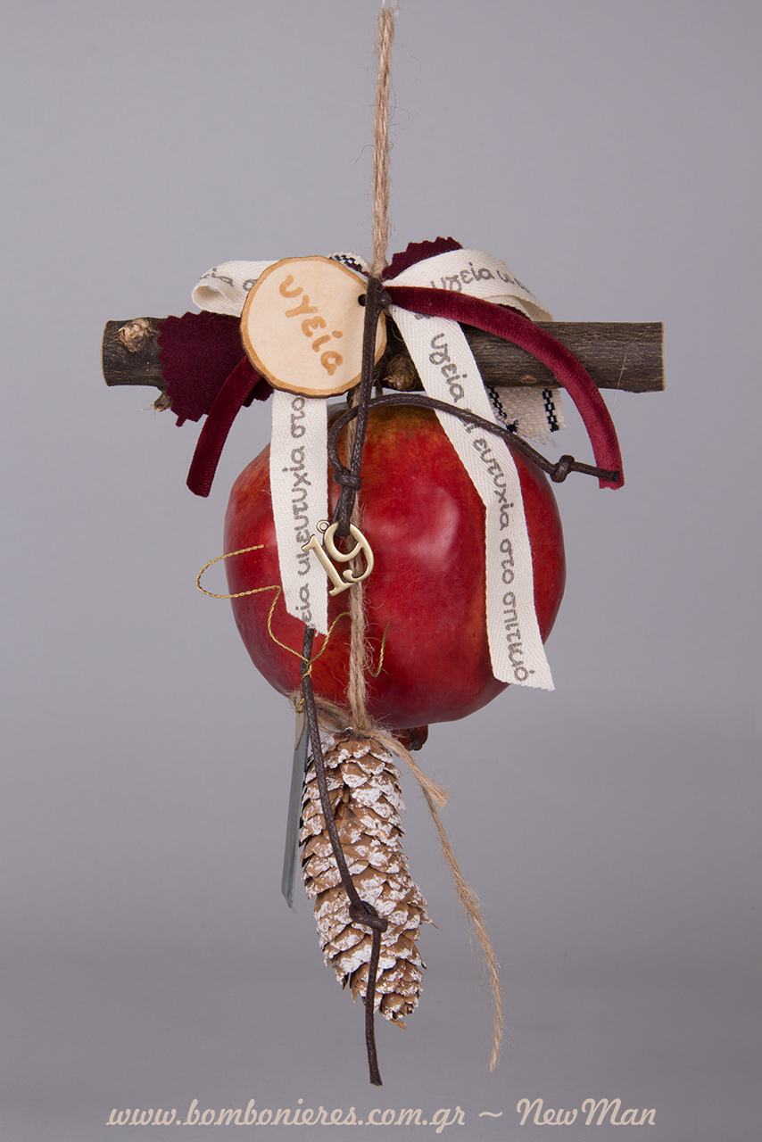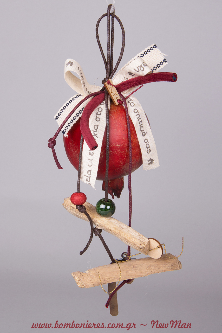 Κρεμαστό κόκκινο ρόδι-γούρι (11cm) με κουκουνάρι, κορδέλες από βελούδο & ευχές, κλαδί και μεταλλικό μοτίφ 19 ή κρεμαστό κόκκινο ρόδι σε δυο υπέροχες εκδοχές με χάντρες, κορδέλες και κομμάτια ξύλου (7cm) για τη διακόσμηση, τα δώρα και φυσικά για να ευχηθείτε με τον πιο ξεχωριστό τρόπο καλές γιορτές και καλή χρονιά στους αγαπημένους σας.