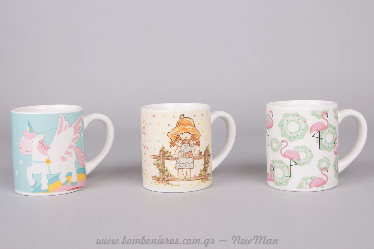 Για τα κοριτσάκια προτείνουμε τις κούπες με σχέδιο φλαμίνγκο, μονόκερω και Sarah Kay.