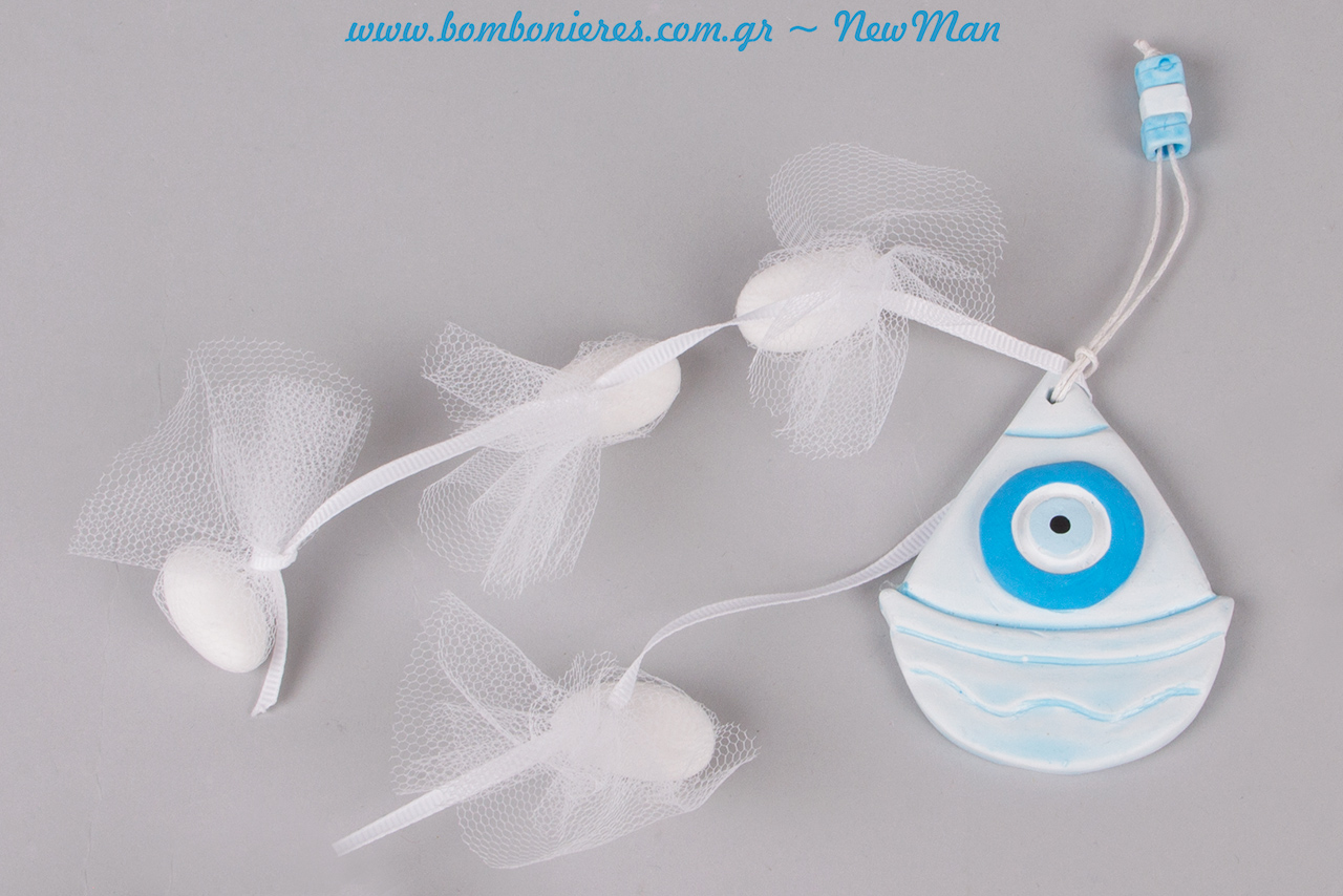 Κρεμαστή μπομπονιέρα γάμου & βάπτισης σε γύψινο τυχερό καραβάκι με σχέδιο μάτι (σιέλ απόχρωση).