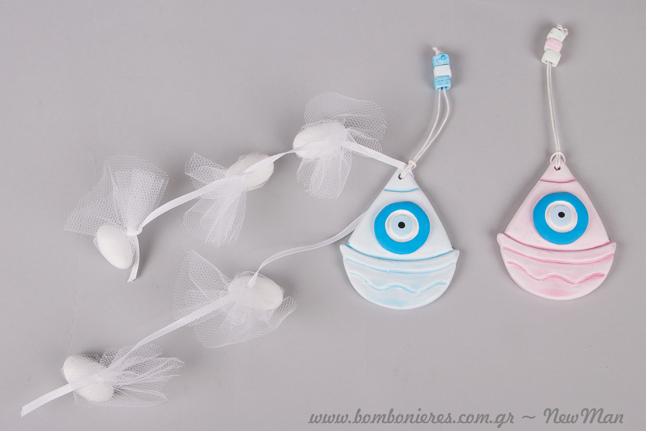 Γύψινα κρεμαστά καραβάκια (ροζ ή σιέλ) με σχέδιο μάτι για τις ταξιδιάρικες, καλότυχες μπομπονιέρες του γάμου ή της βάπτισης.