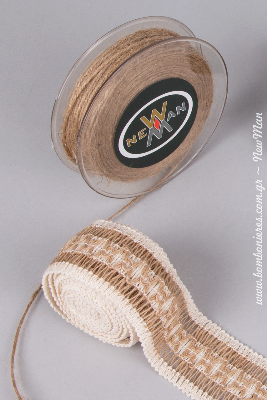 Κορδέλα λινάτσα σε εκρού φυσικό και κορδόνι γιούτα ψιλό για τη διακόσμηση και το στολισμό του Κρητικού σας κεράσματος.