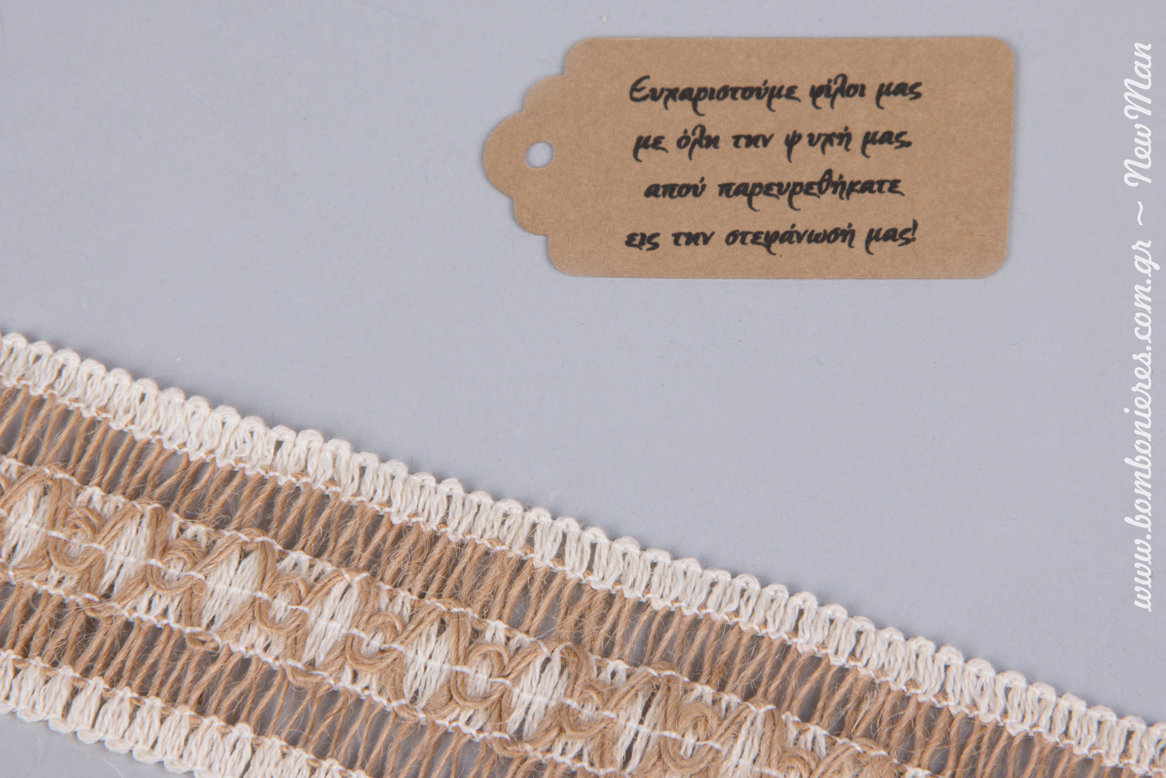Κορδέλα λινάτσα σε εκρού φυσικό (45mm x 3m) και ετικέτα Eco Brown με ευχαριστήρια μαντινάδα.